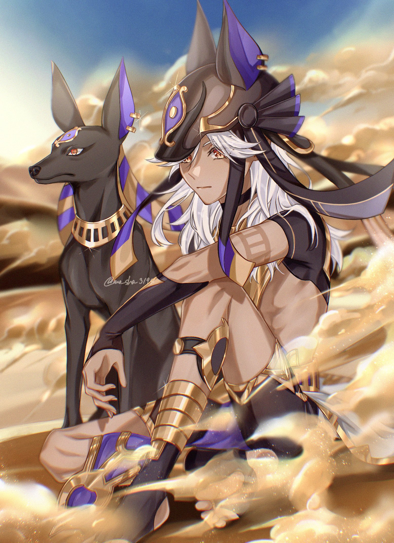 1boy ancient_egyptian_clothes animal animal_ears animal_nose artist_name black_choker black_fur black_gloves black_headwear black_shirt black_shorts blue_sky choker closed_mouth cyno_(genshin_impact) dark-skinned_male dark_skin desert diamond-shaped_pupils diamond_(shape) dust earrings elbow_gloves fake_animal_ears fingerless_gloves fingernails genshin_impact gloves gold_earrings gold_necklace gold_trim hair_between_eyes helmet highres jackal jackal_ears jewelry long_hair looking_to_the_side mo_sha3194 necklace orange_eyes red_eyes sand shirt short_sleeves shorts sitting sky sparkle symbol-shaped_pupils white_hair