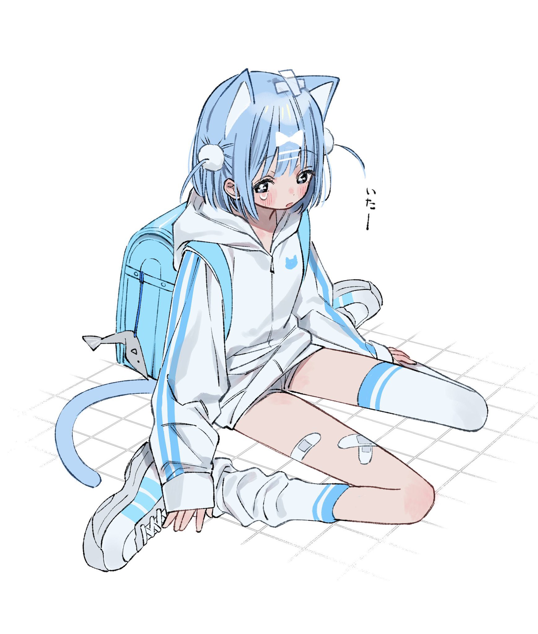 1girl animal_ears backpack bag bandaid bandaid_on_head bandaid_on_leg blue_bag blue_eyes blue_hair bow cat_ears cat_girl cat_tail commentary highres hood hooded_jacket jacket medium_hair original shoes shorts side_ahoge sitting sneakers tail tears thighhighs wariza wata_kinoshi white_background white_bow white_footwear white_jacket white_shoes white_shorts white_thighhighs