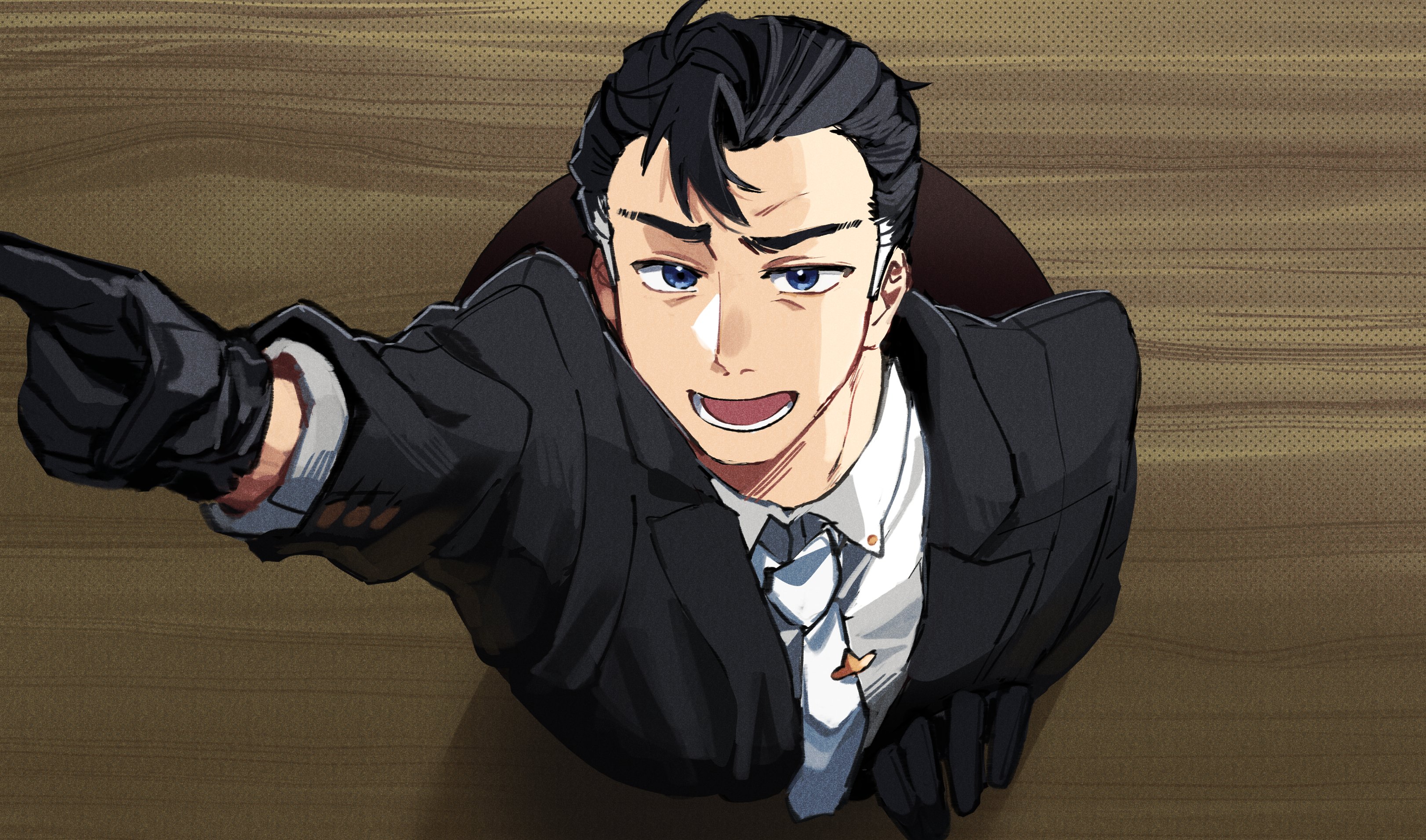 absurdres black_gloves black_hair black_jacket blue_eyes gloves highres jacket jin_gingin larry_(pokemon) madagascar_(series) meme necktie nintendo pointing pokemon pokemon_scarlet_and_violet shirt upper_body white_shirt you_higher_mammal_(meme)