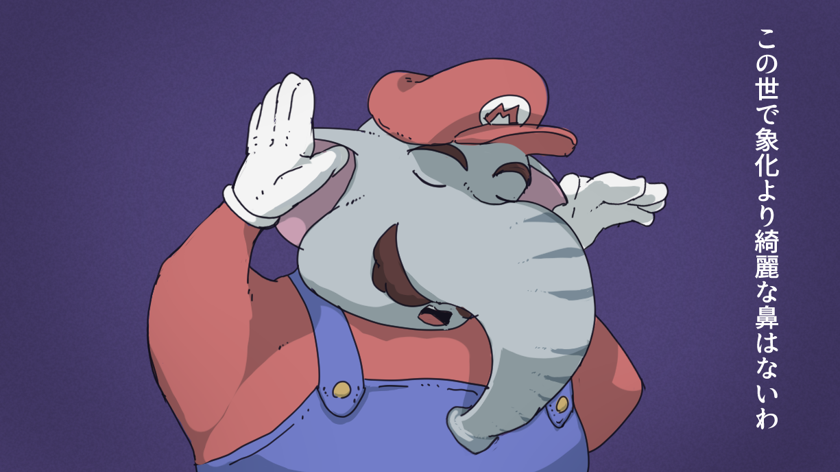 1boy closed_eyes elephant elephant_mario facial_hair gloves hand_up hat mario mario_(series) mustache nintendo overalls power-up standing super_mario_bros._wonder transformation translation_request upper_body wikida_(gebagebaba)