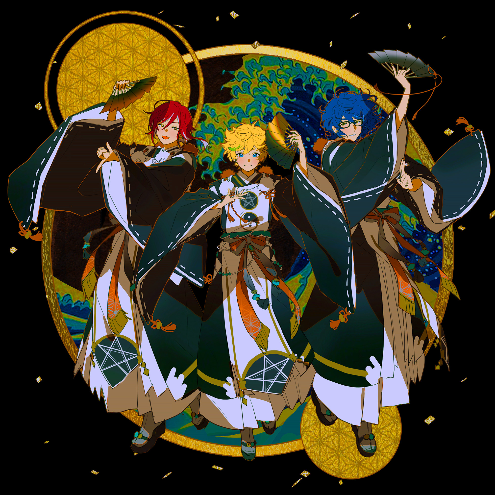 3boys :d aoba_tsumugi arm_up asa_no_ha_(pattern) asymmetrical_sidelocks black-framed_eyewear black_background blonde_hair blue_eyes blue_hair closed_mouth confetti ensemble_stars! folding_fan fringe_trim full_body glasses green_eyes green_sleeves hair_between_eyes hakama hand_fan hand_up harukawa_sora highres holding holding_fan index_finger_raised japanese_clothes kariginu kimono long_sleeves looking_at_viewer male_focus multiple_boys okobo open_mouth orange_sash parted_lips pentagram platform_sandals pom_pom_(clothes) red_hair ribbon-trimmed_sleeves ribbon_trim round_border sakasaki_natsume sandals sash short_hair sidelocks smile socks standing switch_(ensemble_stars!) tabi tk_yrr wavy_hair white_hakama white_kimono white_socks wide_sleeves yellow_eyes yin_yang yin_yang_print