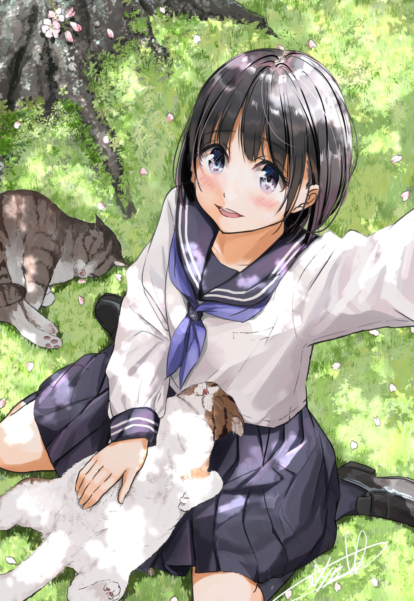 1girl black_footwear black_hair blue_eyes blue_neckerchief blue_sailor_collar blue_skirt blue_socks blush cat cherry_blossoms collarbone commentary day full_body highres kneehighs long_sleeves looking_at_viewer neckerchief open_mouth original outdoors petals petting pleated_skirt puffy_sleeves sailor_collar school_uniform selfie serafuku shirt short_hair signature sitting skirt socks solo soragane_(banisinngurei) spring_(season) taking_picture teeth wariza white_serafuku white_shirt