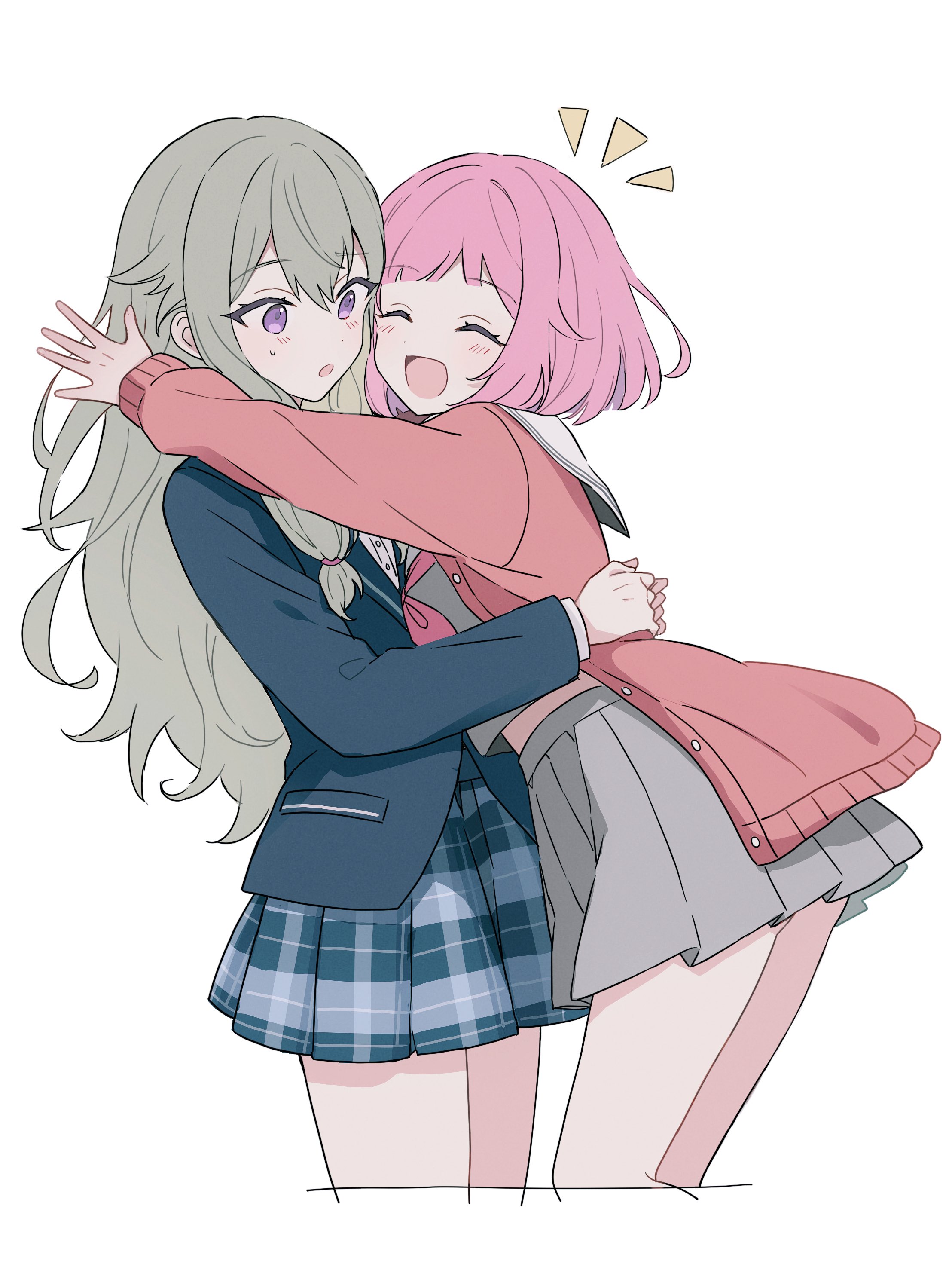 2girls absurdres blazer blunt_bangs blush bob_cut buttons cardigan closed_eyes commentary_request green_hair grey_serafuku grey_skirt highres hrn_ohana hug jacket kamiyama_high_school_uniform_(project_sekai) kusanagi_nene long_hair long_sleeves looking_at_another low-tied_sidelocks midriff_peek miyamasuzaka_girls'_academy_school_uniform multiple_girls neckerchief ootori_emu open_clothes outstretched_hand pink_cardigan pink_hair plaid_clothes plaid_skirt pleated_skirt project_sekai purple_eyes red_neckerchief school_uniform serafuku short_hair sidelocks simple_background skirt white_background