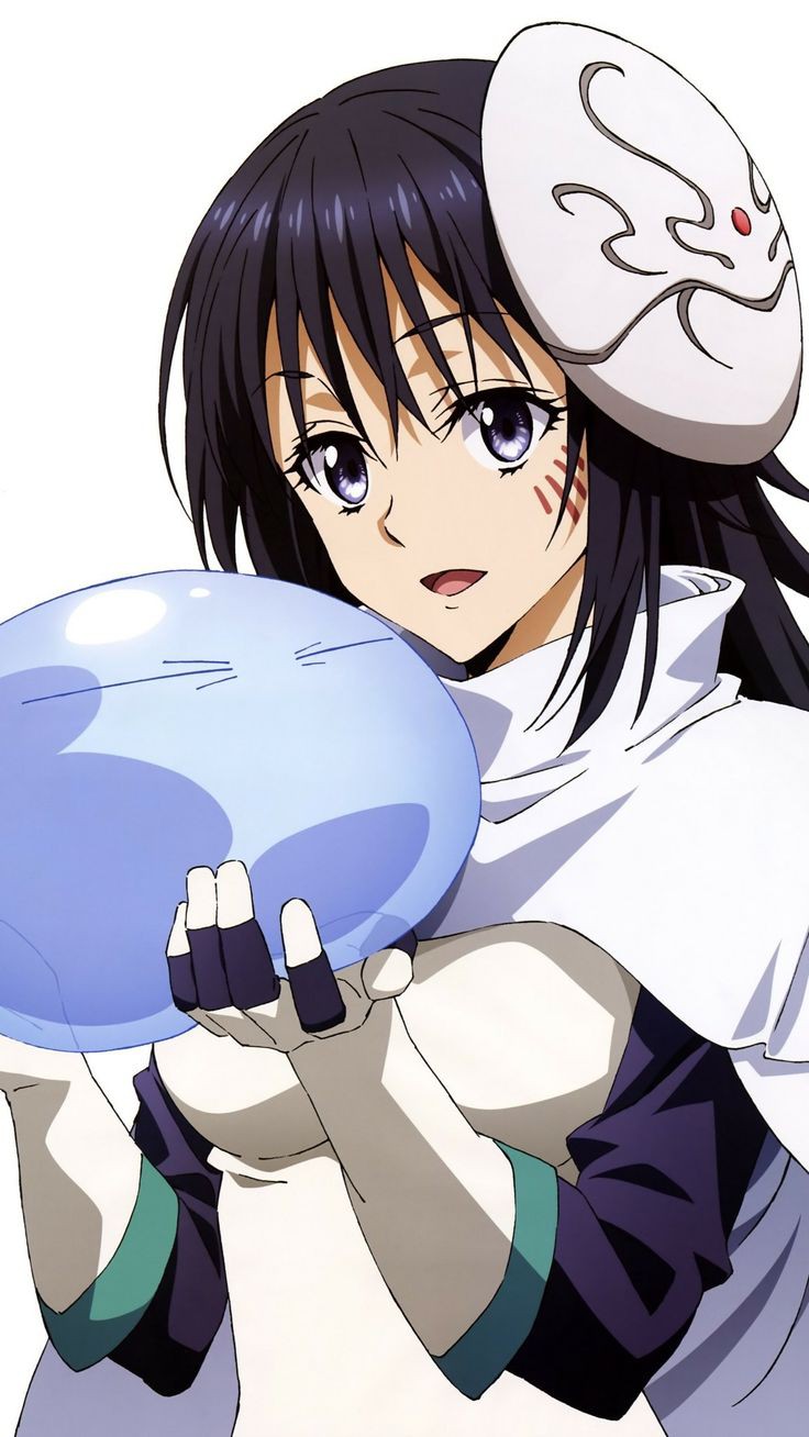 1girl black_hair black_sleeves blue_eyes blush cape gloves highres izawa_shizue long_hair mask rimuru_tempest shirt simple_background sleeveless slime_(creature) smile tensei_shitara_slime_datta_ken very_long_hair white_background white_cape white_gloves white_shirt yano_akane