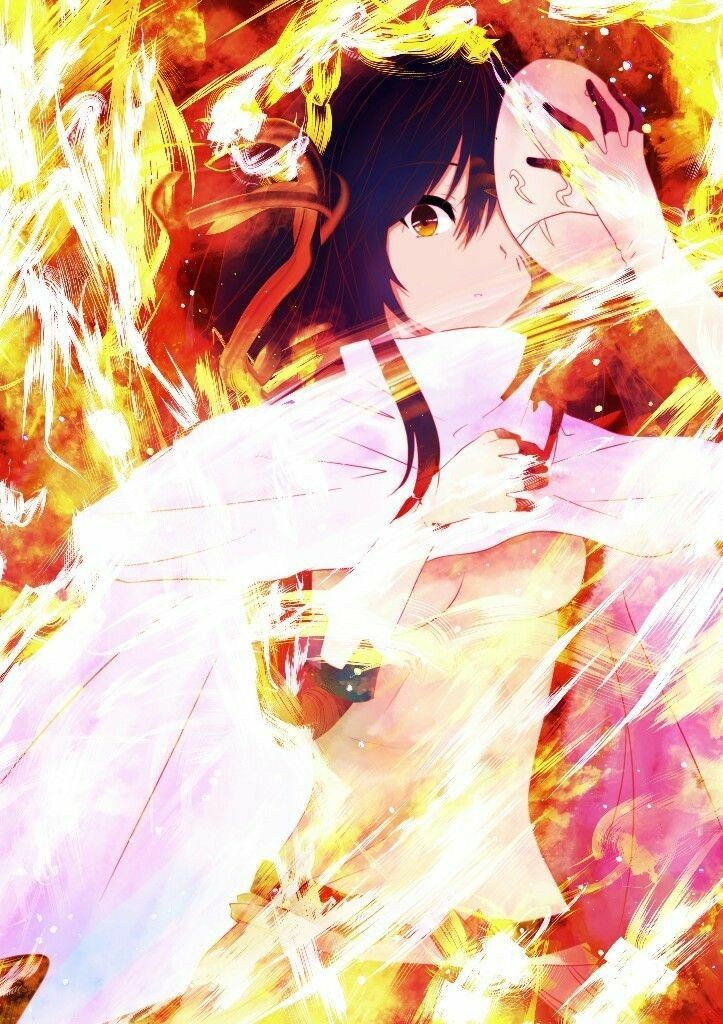 1girl black_hair blue_eyes fire gloves izawa_shizue long_hair looking_at_viewer mask shirt tensei_shitara_slime_datta_ken very_long_hair white_gloves white_shirt white_sleeves yellow_eyes