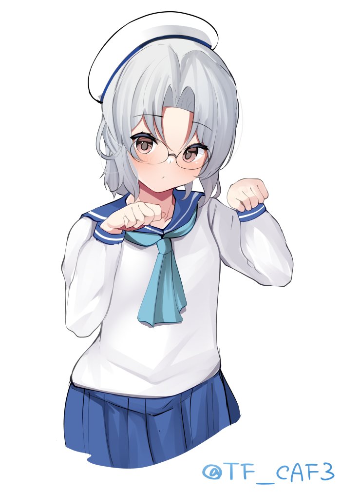 1girl blue_neckerchief blue_skirt closed_mouth cowboy_shot cropped_legs grey_hair hat hirato_(kancolle) kantai_collection long_sleeves looking_at_viewer neckerchief one-hour_drawing_challenge pleated_skirt rimless_eyewear round_eyewear sailor_collar sailor_hat shirt short_hair simple_background skirt solo tf_cafe twitter_username white_background white_hat white_shirt yellow_eyes