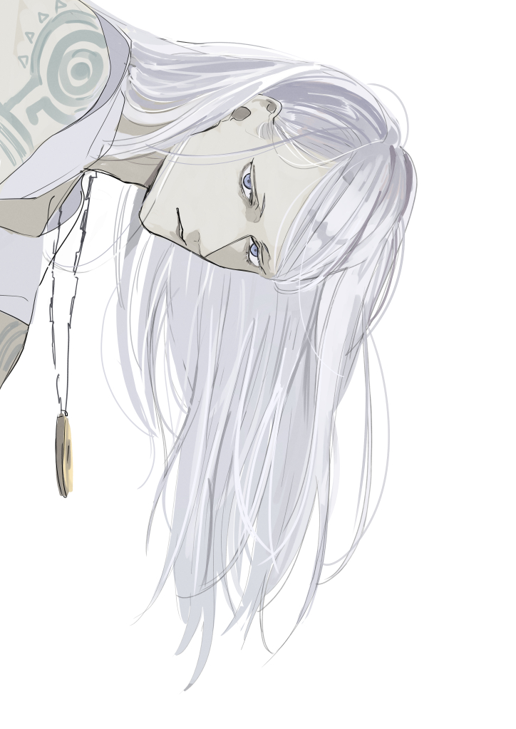 1boy alternate_hair_color arm_tattoo fate/grand_order fate_(series) long_hair looking_at_viewer male_focus medallion riku_gotaro shoulder_tattoo simple_background solo tattoo tezcatlipoca_(fate) tezcatlipoca_(first_ascension)_(fate) upper_body white_background white_hair