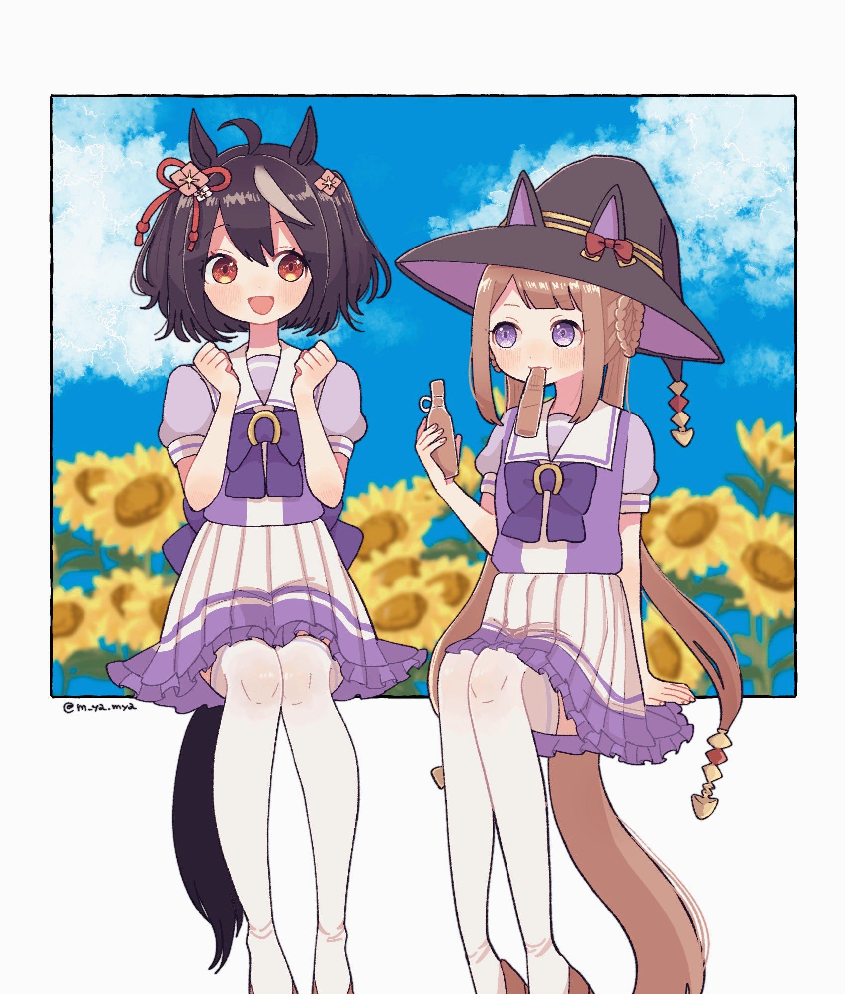2girls :d ahoge animal_ears black_hair blue_sky blurry blurry_background brown_hair cloud cloudy_sky day flower frilled_skirt frills hair_ornament hair_rings hat highres horse_ears horse_girl horse_tail kitasan_black_(umamusume) knees_together_feet_apart long_hair looking_at_another miya_(m_ya_mya) multiple_girls open_mouth pleated_skirt purple_eyes red_eyes school_uniform skirt sky smile summer_uniform sunflower sweep_tosho_(umamusume) tail thighhighs tracen_school_uniform tupet twintails twitter_username umamusume white_background white_thighhighs witch_hat zettai_ryouiki
