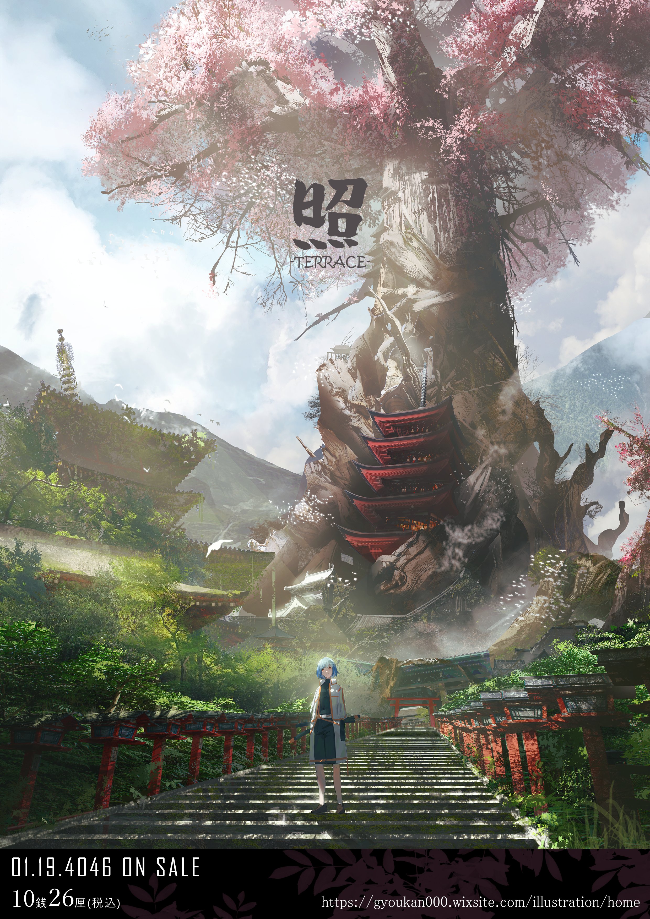 1girl absurdres architecture bird black_shirt black_shorts blue_hair breasts cherry_blossoms closed_mouth cloud commentary_request day east_asian_architecture english_text flock gyoukan_(jfxc) highres jacket landscape lantern long_sleeves medium_breasts moss mountain nature open_clothes open_jacket orange_eyes original outdoors pagoda plant ruins scenery shadow shirt shorts shrine sky solo stairs standing torii translation_request tree two-tone_shorts very_wide_shot white_jacket white_shorts wide_shot