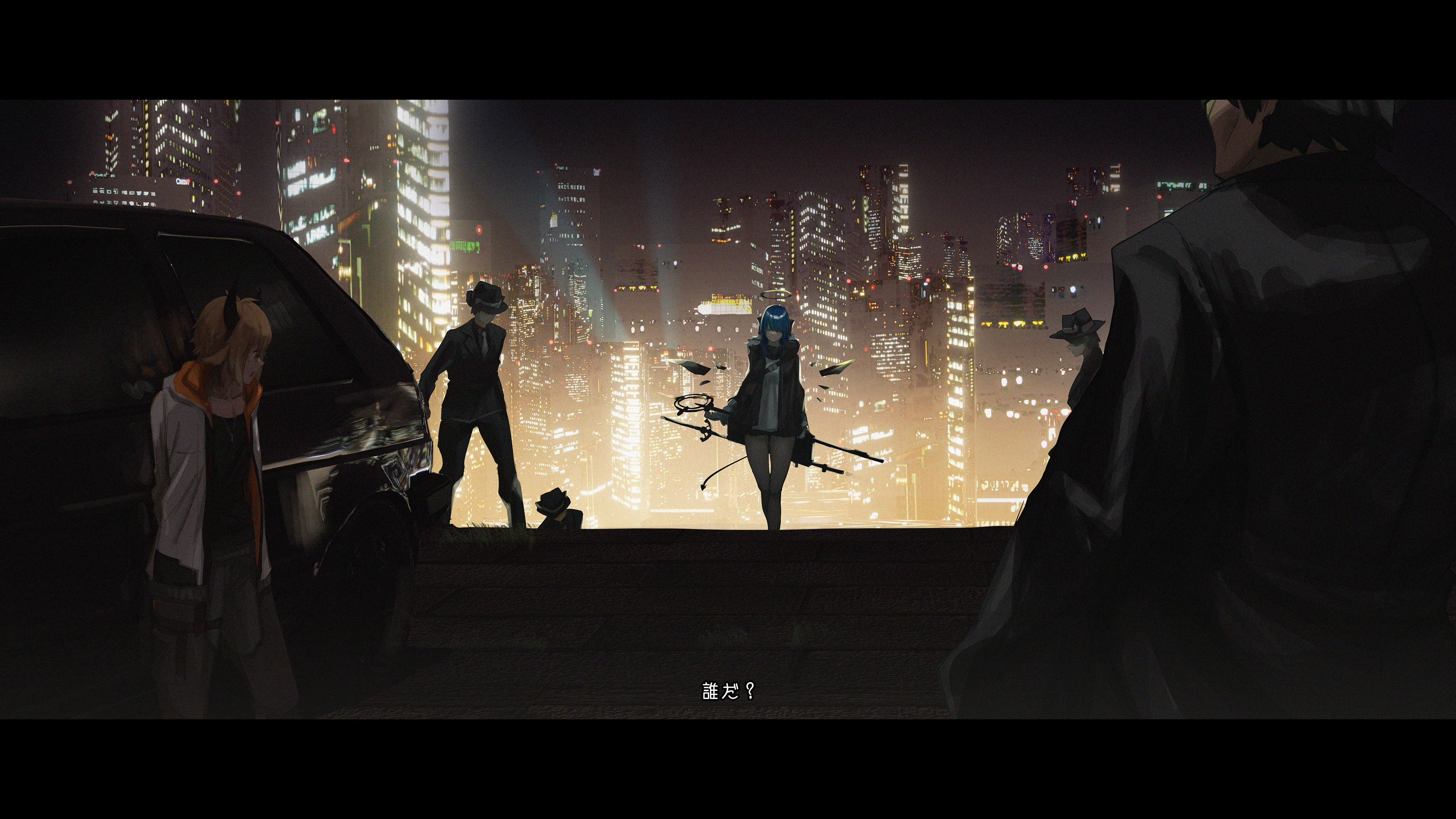 1boy 4boys absurdres animal_ears arknights bare_legs bison_(arknights) black_headwear black_jacket black_pants black_shirt blonde_hair blue_eyes blue_hair capone_(arknights) car city_lights cityscape closed_mouth collarbone commentary_request cow_boy cow_horns demon_horns detached_wings energy_wings fallen_angel formal_clothes fur-trimmed_hood fur_trim gloves gyoukan_(jfxc) hair_between_eyes halo hat highres hood hooded_jacket horns jacket jewelry letterboxed long_hair mostima_(arknights) motor_vehicle multiple_boys necklace night open_clothes open_jacket outdoors pants shirt short_hair sky smile staff suit translation_request walking white_gloves white_jacket white_shirt wings wolf_boy wolf_ears