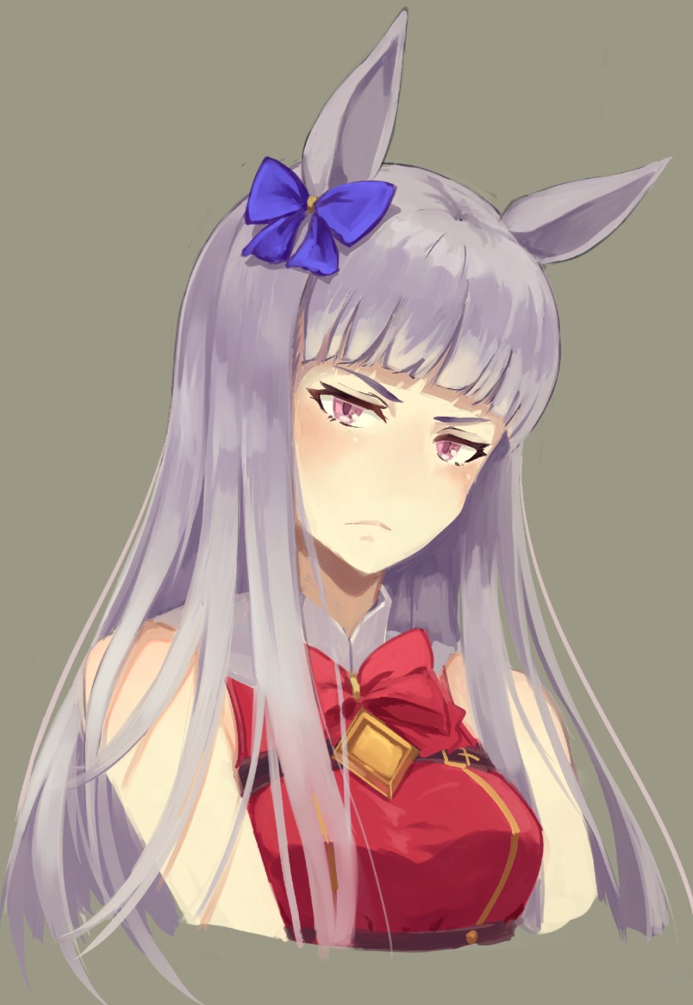 1girl animal_ears bare_shoulders blush bow bowtie breasts closed_mouth cropped_torso dress ear_bow frown gold_ship_(umamusume) highres horse_ears long_hair looking_at_viewer pink_eyes purple_hair red_dress shiro3necro simple_background sleeveless sleeveless_dress small_breasts solo umamusume upper_body