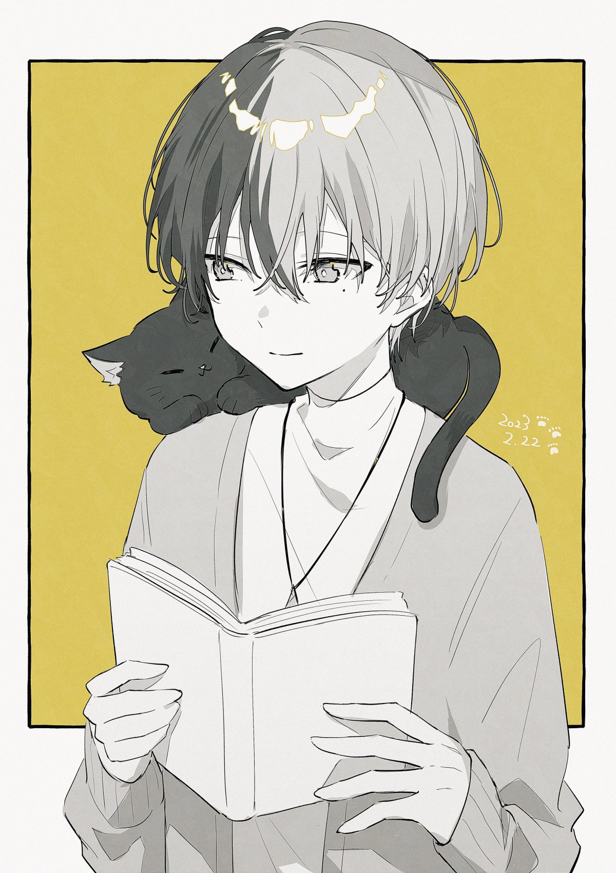1boy aged_down animal_ears aoyagi_touya book cat_ears cat_tail child closed_eyes closed_mouth commentary dated hair_between_eyes highres holding holding_book jewelry jishio long_sleeves looking_at_animal male_focus mole mole_under_eye multicolored_hair necklace open_book paw_print project_sekai short_hair smile solo split-color_hair tail two-tone_hair upper_body