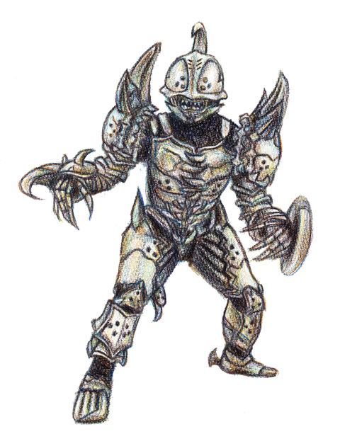 armor claws full_body horns kamen_rider kamen_rider_kabuto_(series) konmurai monster no_humans open_mouth scorpio_worm sharp_teeth shoulder_armor simple_background teeth tokusatsu traditional_media white_background