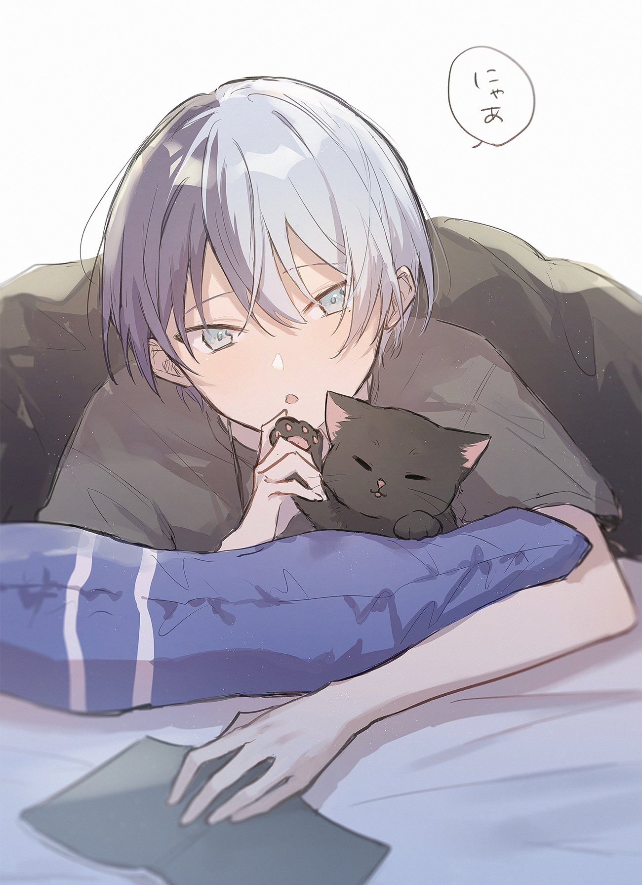 1boy :o animal_ears animal_hands aoyagi_touya black_cat blue_eyes blue_hair book cat cat_ears closed_eyes commentary dark_blue_hair grey_shirt highres holding holding_book jishio lying male_focus mole mole_under_eye multicolored_hair on_stomach open_book open_mouth pillow project_sekai shirt short_hair short_sleeves solo speech_bubble split-color_hair untranslatable_commentary translation_request two-tone_hair white_background