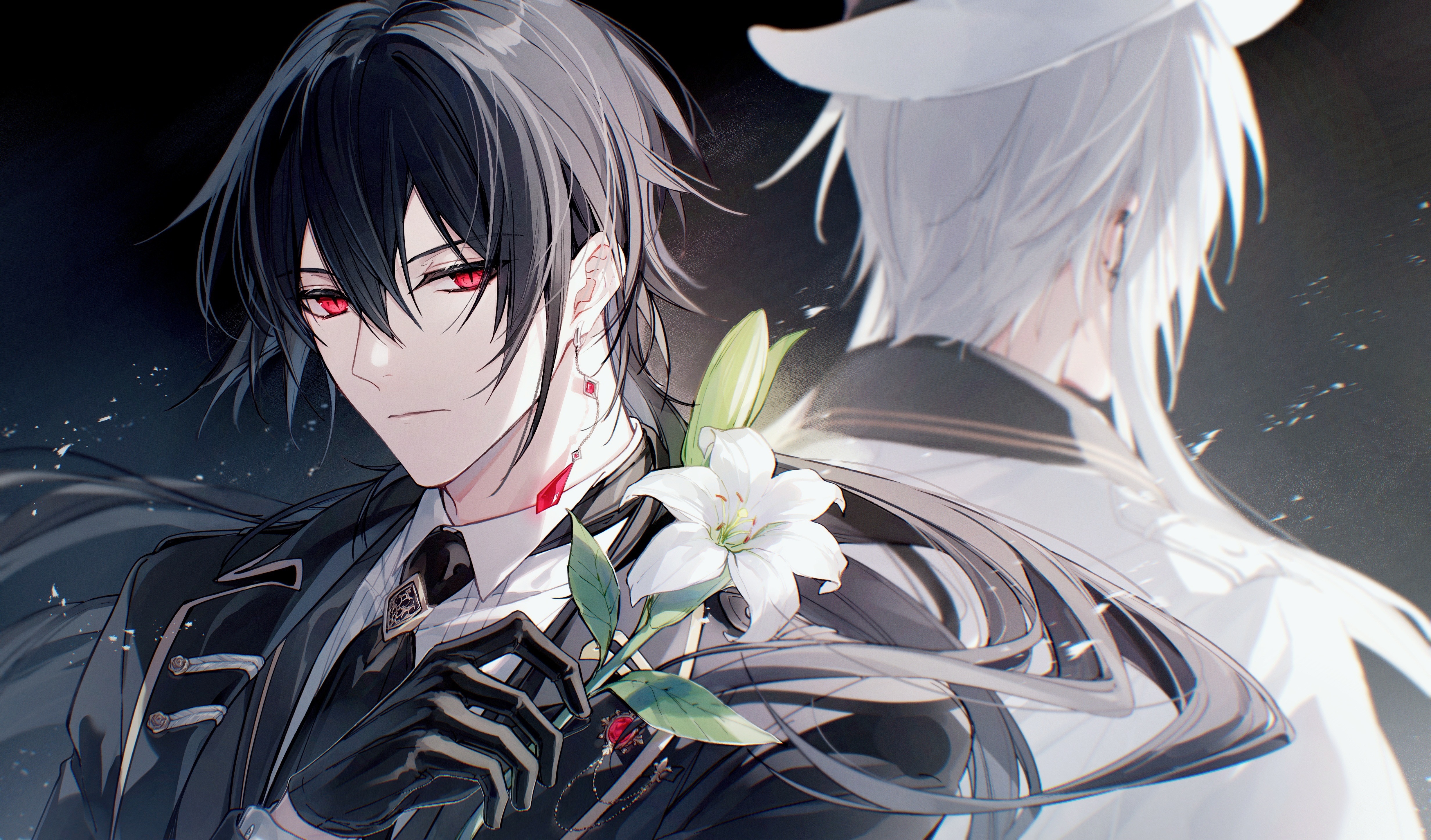 2boys absurdres black_coat black_gloves black_hair black_necktie check_copyright closed_mouth coat collared_shirt copyright_request earrings flower gloves hair_between_eyes highres holding holding_flower jewelry long_hair long_sleeves looking_at_viewer male_focus mochizuki_shiina multiple_boys necktie open_clothes original red_eyes shirt white_hair white_shirt