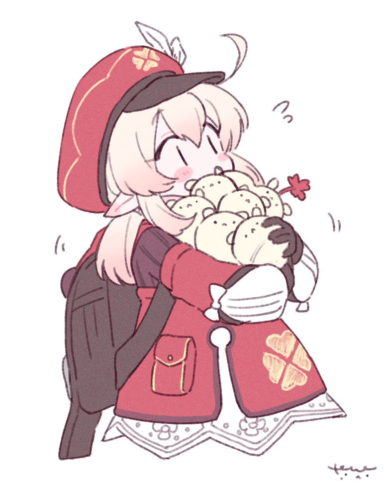 1girl ahoge backpack bag black_gloves blonde_hair blush newsboy_cap clover cropped_legs flying_sweatdrops four-leaf_clover genshin_impact gloves hair_between_eyes hat hat_feather holding homare_(g_hmr88) klee_(genshin_impact) long_sleeves low_twintails pointy_ears red_hat sidelocks signature simple_background solo twintails white_background