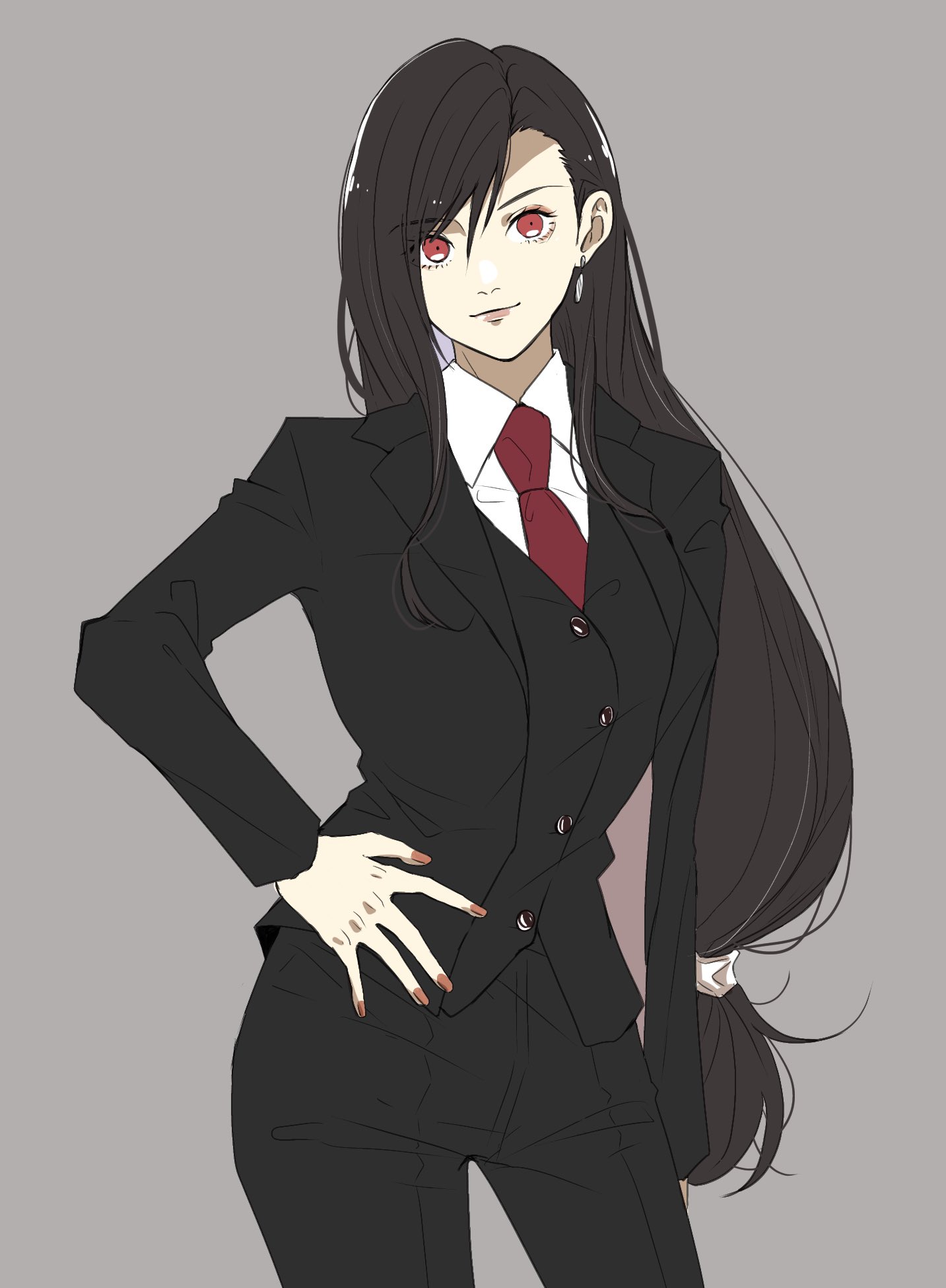 alternate_costume black_hair black_jacket black_pants breasts buttons closed_mouth collared_shirt commentary cowboy_shot earrings final_fantasy final_fantasy_vii formal_clothes grey_background hair_behind_ear hand_on_own_hip highres jacket jewelry light_smile long_hair looking_at_viewer low-tied_long_hair medium_breasts necktie pants red_eyes red_nails red_necktie shirt single_earring single_sidelock suit swept_bangs teardrop_earring teardrop_earrings tifa_lockhart turks_(costume) wan_tarowou32 white_shirt