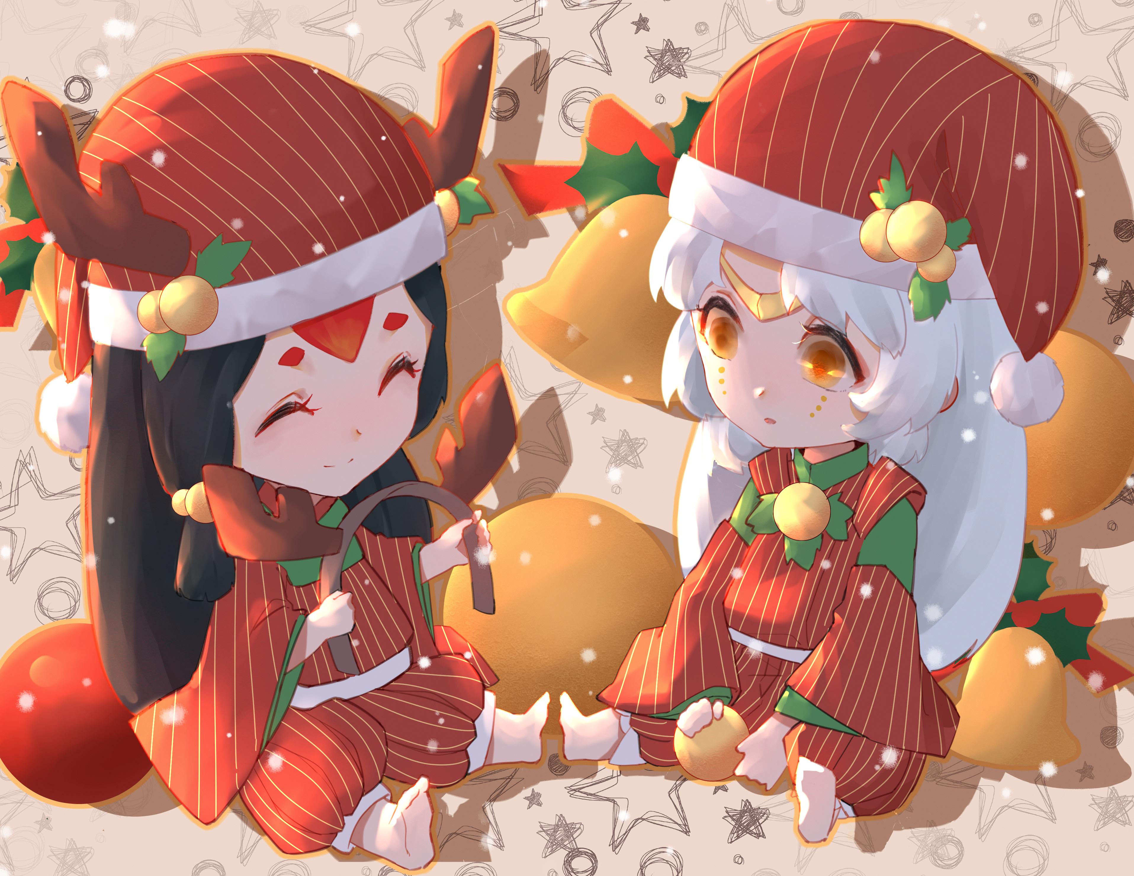 2boys absurdres antlers barefoot bell black_hair brown_background chibi christmas closed_eyes deer_antlers full_body hat highres holding_hairband horns japanese_clothes kariginu kurodouji long_sleeves looking_at_another multiple_boys on_floor onmyoji pants puffy_pants red_headwear red_pants santa_costume santa_hat shirodouji sitting smile striped_clothes striped_headwear striped_pants vertical-striped_clothes vertical-striped_headwear vertical-striped_pants white_hair wide_sleeves yellow_eyes yi_er_san