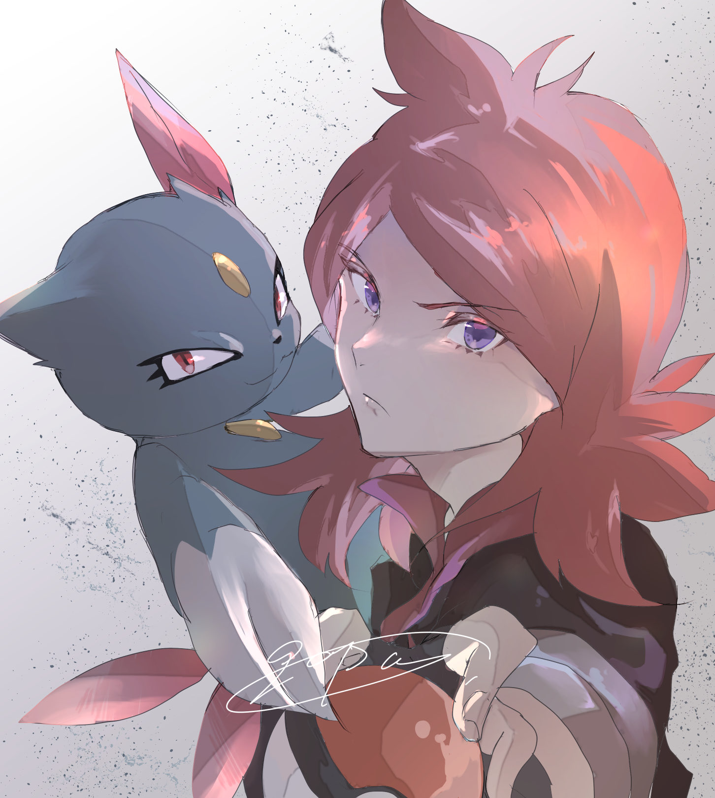 1boy gen_2_pokemon gopan_(pkghnman) gradient_background grey_background highres holding holding_poke_ball looking_at_viewer male_focus nintendo official_alternate_costume poke_ball poke_ball_(basic) pokemon pokemon_(creature) pokemon_masters_ex purple_eyes red_eyes red_hair signature silver_(pokemon) silver_(sygna_suit)_(pokemon) sneasel upper_body