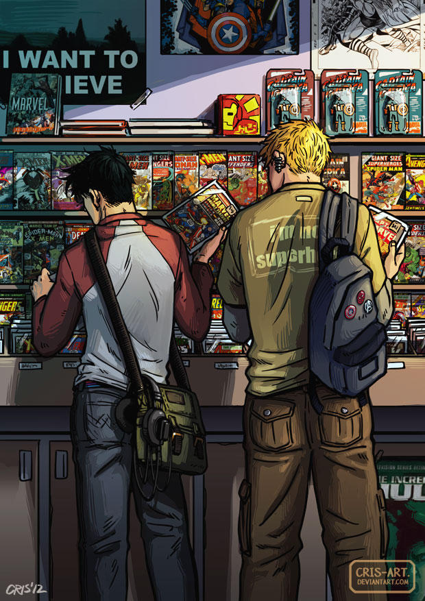 2boys backpack bag bara black_hair blonde_hair book bookstore captain_america character_request couple cris_art feet_out_of_frame figure from_behind holding holding_book hulk hulkling iron_man layered_shirt male_focus marvel merchandise multiple_boys red_sleeves shop short_hair spider-man spider-man_(original_suit) standing thick_eyebrows western_comics_(style) wiccan yaoi