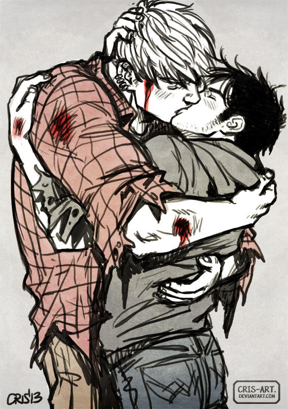 2boys bara black_hair blonde_hair blood blood_on_clothes blush bruise couple cris_art denim facial_hair hand_on_another's_head hug hulkling injury jeans kiss long_sideburns male_focus marvel multiple_boys muted_color mutual_hug pants short_hair sideburns sideburns_stubble sketch sparse_stubble stubble thick_eyebrows toned toned_male wiccan yaoi