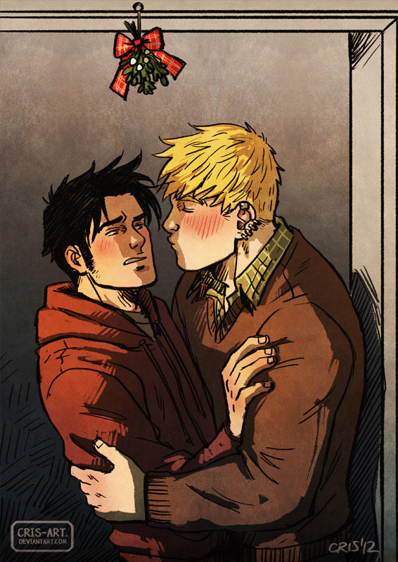 2boys bara black_hair blonde_hair blush couple cris_art ear_piercing from_side hand_on_another's_arm hood hoodie hulkling imminent_kiss layered_shirt long_sideburns male_focus marvel mistletoe multiple_boys piercing raised_eyebrow red_hoodie short_hair sideburns thick_eyebrows upper_body wiccan yaoi