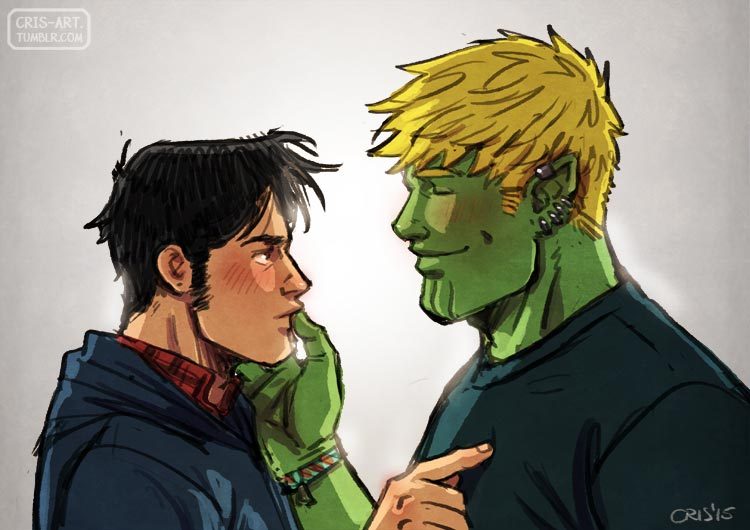2boys alien bad_id bad_tumblr_id bara black_hair blonde_hair blush closed_eyes colored_skin couple cris_art ear_piercing facial_hair finger_to_another's_mouth from_side green_skin hulkling long_sideburns male_focus marvel multiple_boys pectorals piercing poking poking_pecs shirt short_hair sideburns sideburns_stubble smile stubble t-shirt thick_eyebrows toned toned_male upper_body wiccan yaoi