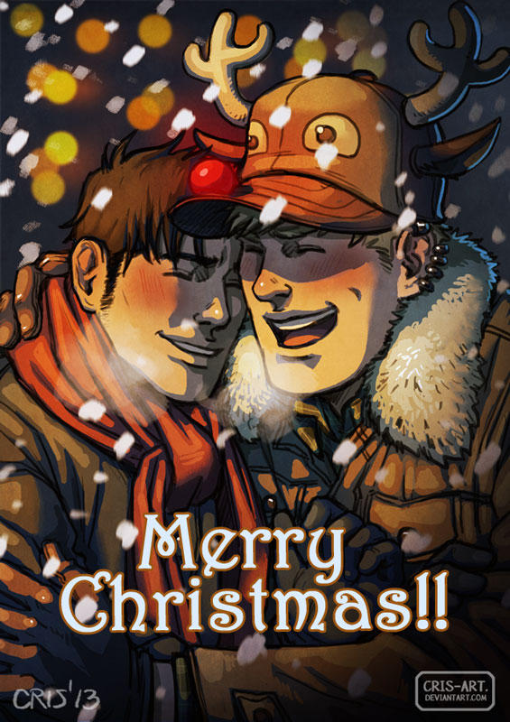 2boys antlers bara black_hair blonde_hair breath couple cris_art hand_on_another's_neck horns hulkling laughing long_sideburns male_focus marvel merry_christmas multiple_boys red_scarf reindeer_antlers reindeer_hat scarf short_hair sideburns snowing thick_eyebrows upper_body wiccan winter winter_clothes yaoi