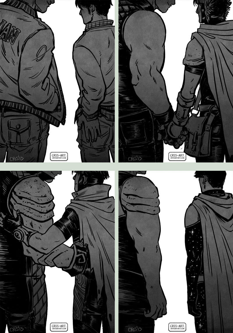 2boys alien alternate_costume arms_at_sides bara bare_arms black_hair blonde_hair cape collage couple cris_art denim feet_out_of_frame from_behind gloves greyscale hand_on_another's_back head_out_of_frame holding_hands hulkling interspecies jacket jeans long_sideburns male_focus marvel monochrome multiple_boys muscular muscular_male pants progression short_hair sideburns sleeveless smile starry_bodysuit superhero_costume thick_eyebrows wiccan yaoi
