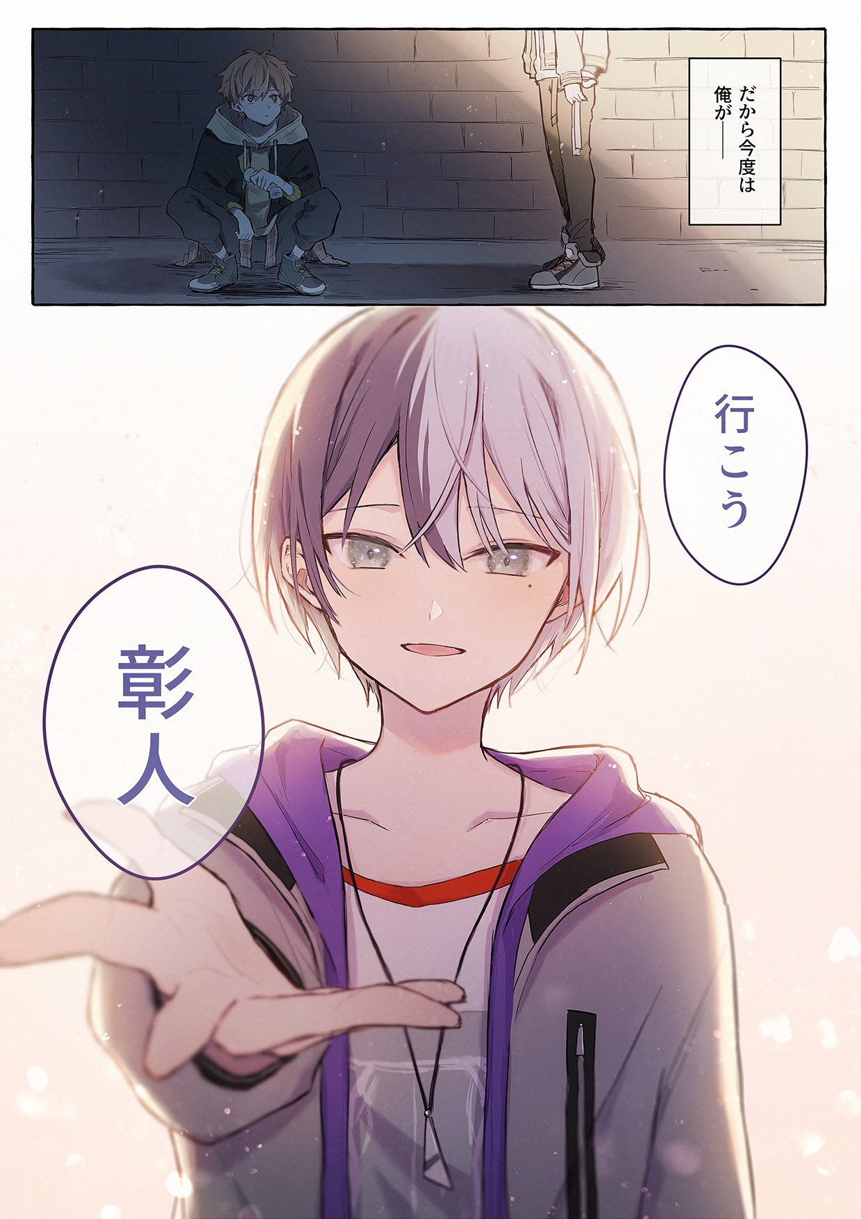 2boys 2koma aoyagi_touya arm_at_side blue_hair bottle closed_mouth comic commentary_request dark_blue_hair drawstring grey_eyes highres holding holding_bottle hood hood_down hoodie jacket jewelry jishio long_sleeves looking_at_viewer male_focus mole mole_under_eye multicolored_hair multiple_boys necklace open_clothes open_jacket open_mouth outstretched_arm outstretched_hand project_sekai shinonome_akito short_hair split-color_hair squatting translation_request two-tone_hair upper_body zipper zipper_pull_tab