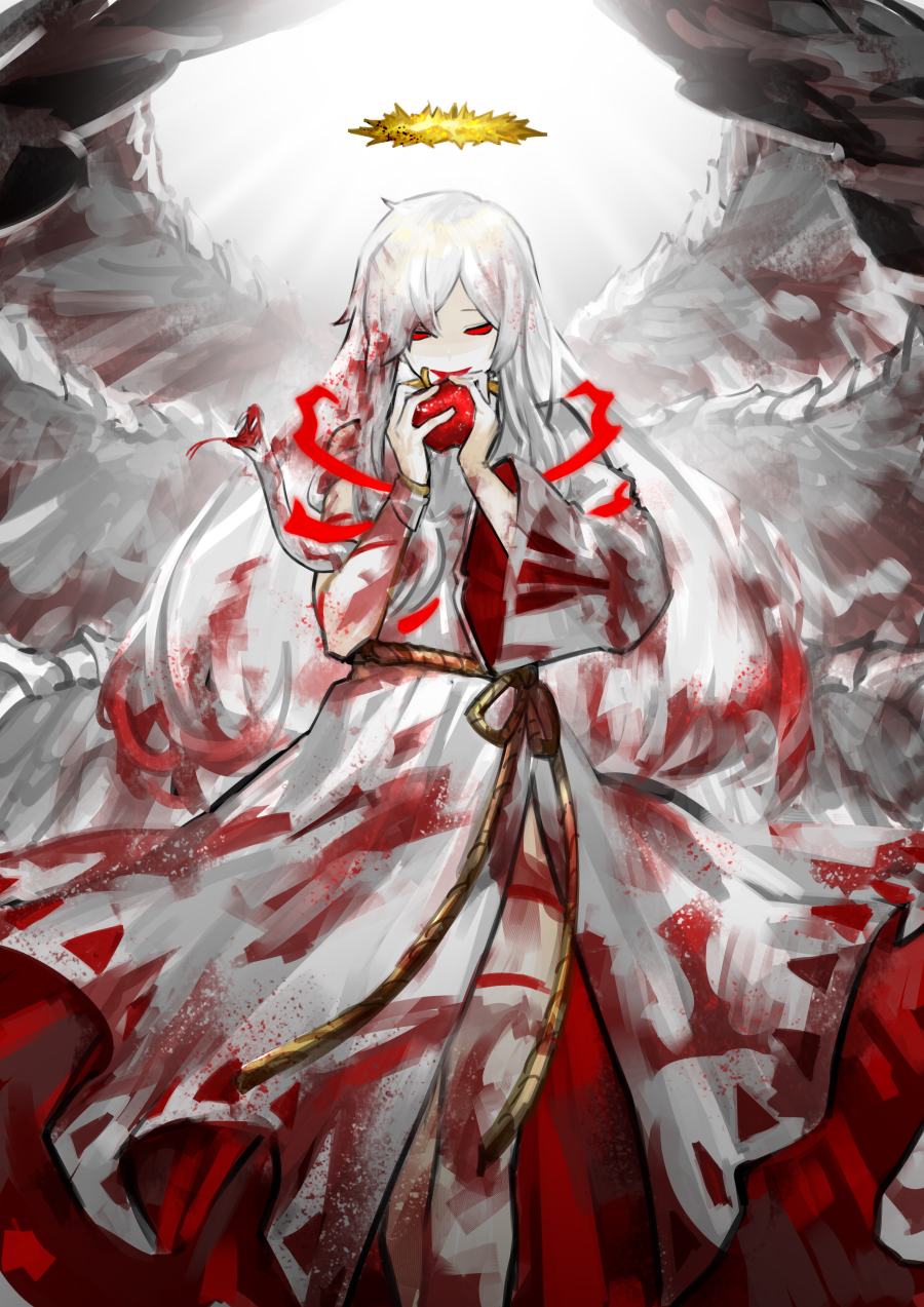 1girl angela_(project_moon) apple asymmetrical_sleeves belt blood blood_on_clothes colored_sclera dress e.g.o_(project_moon) food fruit halo highres holding holding_food holding_fruit library_of_ruina long_hair long_sleeves multiple_wings nishikujic paradise_lost_(e.g.o) parted_lips project_moon red_sclera remorse_(e.g.o) rope seraph short_sleeves sidelocks smile solo uneven_sleeves very_long_hair white_dress white_hair white_wings whitenight_(project_moon) wide_sleeves wings