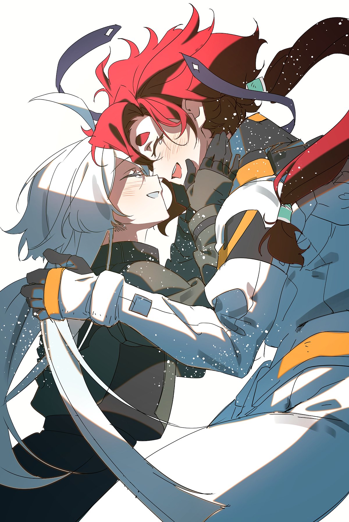 2girls ahoge closed_eyes couple gundam gundam_suisei_no_majo hand_on_another's_face highres light_blush long_hair mecha_pilot_suit miorine_rembran multiple_girls normal_suit_(gundam) open_mouth ponytail red_hair seza_(enlwnaos) simple_background smile spacesuit suletta_mercury thick_eyebrows white_background yuri
