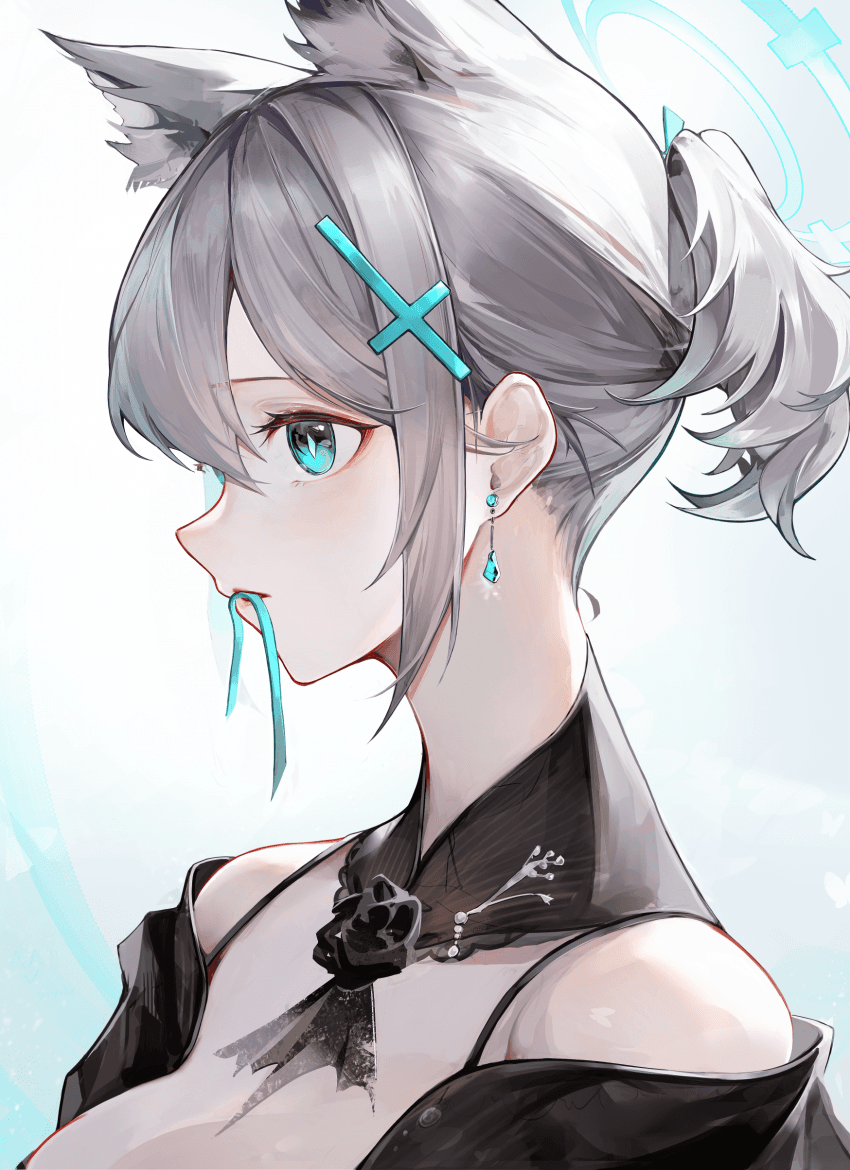 1girl alternate_costume alternate_hairstyle animal_ear_fluff animal_ears biting black_choker black_gloves blue_archive blue_eyes choker earrings extra_ears gloves grey_hair hair_ornament hairpin halo jewelry looking_to_the_side mouth_hold off_shoulder ponytail shiroko_(blue_archive) simple_background solo string toki_(rumukio) white_background wolf_ears