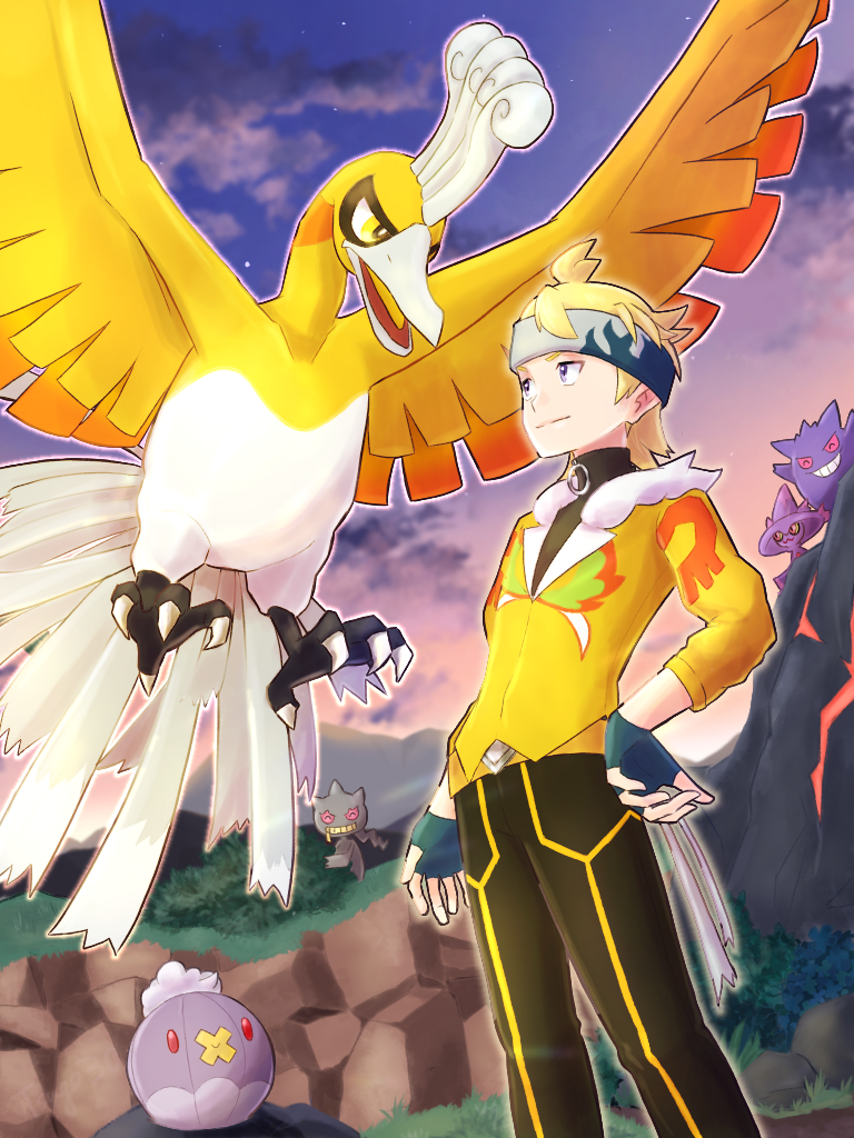 1boy alternate_color banette beak blonde_hair drifblim fingerless_gloves gen_1_pokemon gen_2_pokemon gen_3_pokemon gen_4_pokemon gengar gloves ho-oh legendary_pokemon male_focus mismagius morty_(pokemon) morty_(sygna_suit)_(pokemon) nintendo official_alternate_costume pokemon pokemon_(creature) pokemon_masters_ex shiny_pokemon smile tsugomori_(sprn303) wings yellow_eyes