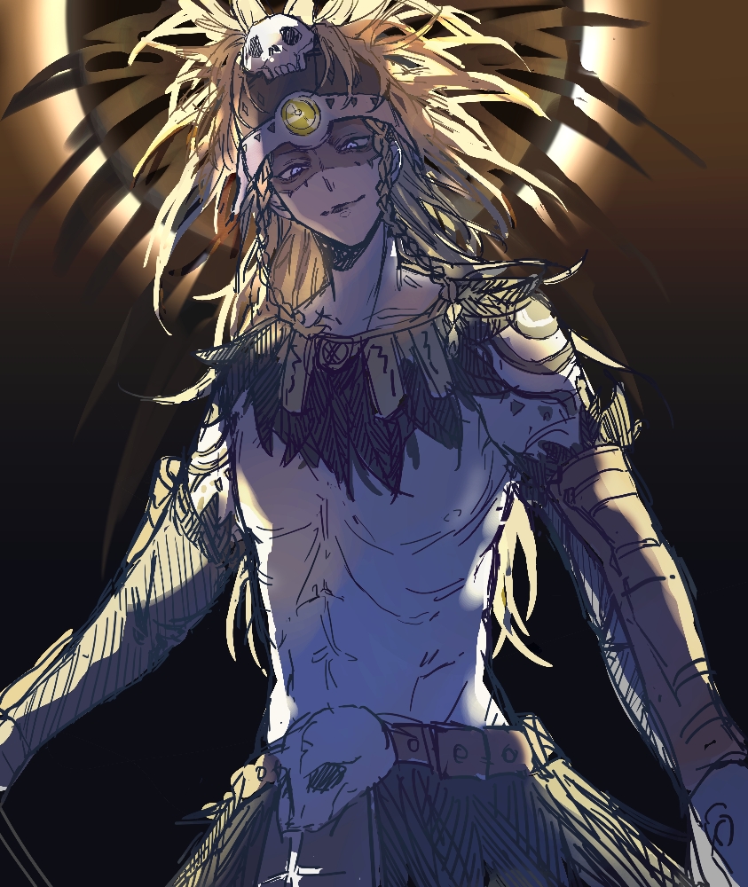 1boy arm_tattoo aztec blonde_hair blue_eyes braid facepaint fate/grand_order fate_(series) gold_necklace hair_ornament headdress jewelry long_hair looking_at_viewer male_focus necklace norai0813 shoulder_tattoo skull skull_hair_ornament smile solo tattoo tezcatlipoca_(fate) tezcatlipoca_(third_ascension)_(fate) topless_male traditional_clothes twin_braids upper_body