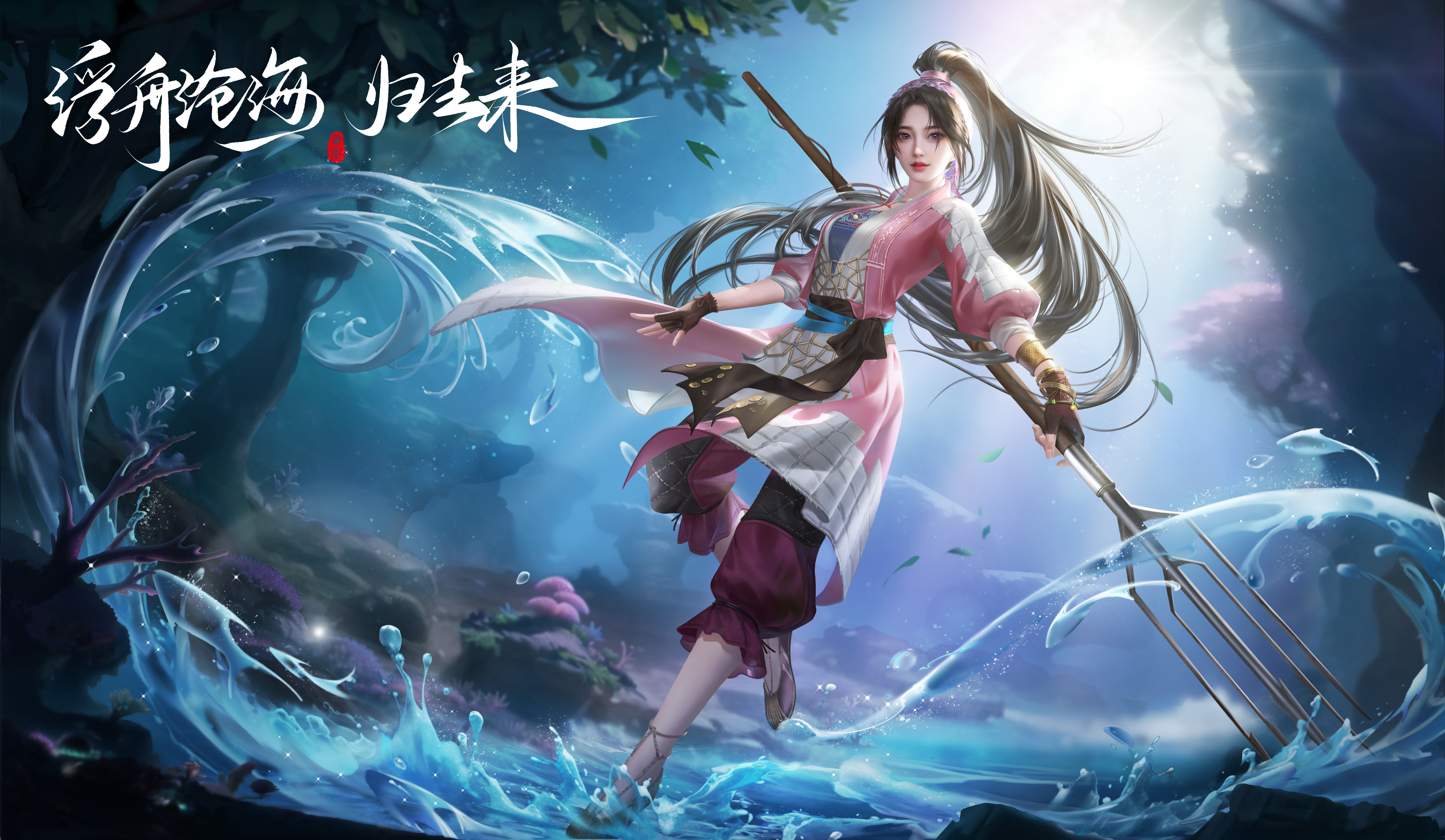 1girl absurdres brown_hair chang_tui_gugu closed_mouth fingerless_gloves full_body gloves hair_tie hairband highres holding_polearm jacket juan_siliang leg_up long_hair looking_at_viewer pants pink_jacket polearm purple_pants second-party_source solo splashing sun tree trident tu_li_(juan_siliang) underwater weapon