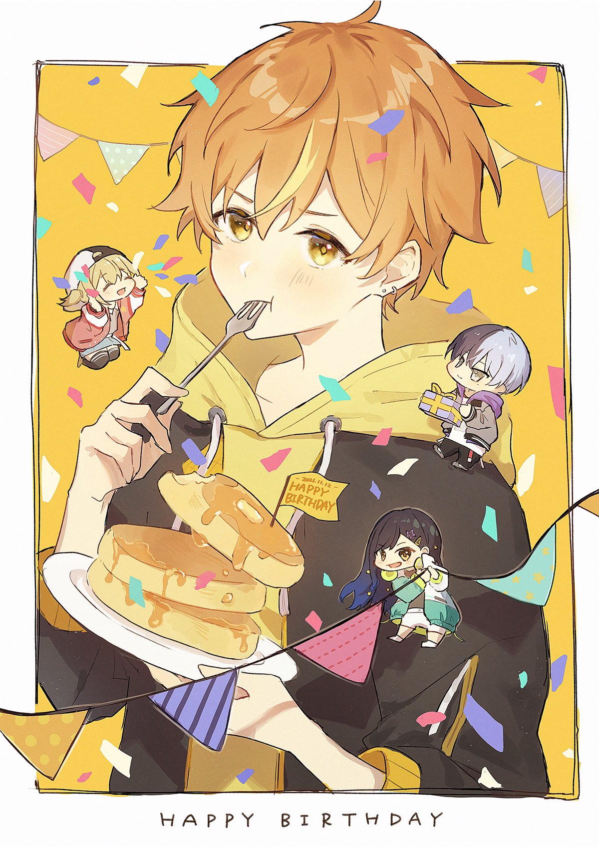 2boys 2girls aoyagi_touya azusawa_kohane baseball_cap black_hair blonde_hair blue_hair blush border bow closed_eyes closed_mouth commentary_request confetti dark_blue_hair dated drawstring earrings flag food fork gift gradient_hair grey_eyes hair_ornament hairclip happy_birthday hat headphones headphones_around_neck highres holding holding_fork holding_gift holding_plate hood hooded_jacket hoodie hoop_earrings jacket jewelry jishio long_sleeves mole mole_under_eye multicolored_hair multiple_boys multiple_girls open_clothes open_jacket open_mouth orange_eyes orange_hair pancake pancake_stack plate project_sekai purple_hood shinonome_akito shiraishi_an short_hair short_twintails shorts three-quarter_sleeves star_(symbol) star_hair_ornament streaked_hair string_of_flags twintails two-tone_hair vivid_bad_squad_(project_sekai) white_border yellow_bow yellow_hoodie