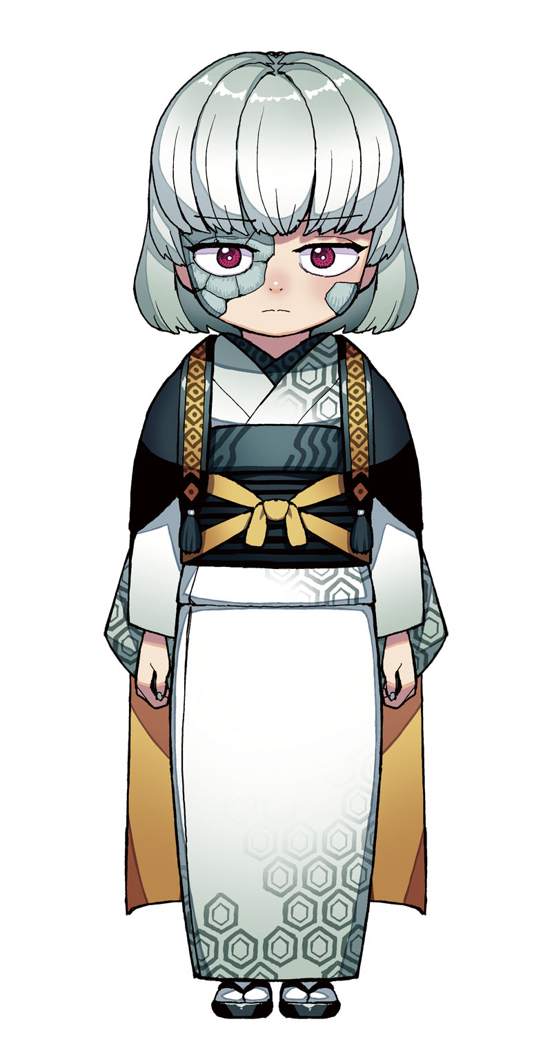 1girl chibi commentary_request frown full_body grey_hair hamada_yoshikazu hexagon_print highres iwanagahime_(tsugumomo) japanese_clothes kimono long_sleeves looking_at_viewer obi official_art red_eyes sash short_hair simple_background solo tsugumomo white_background