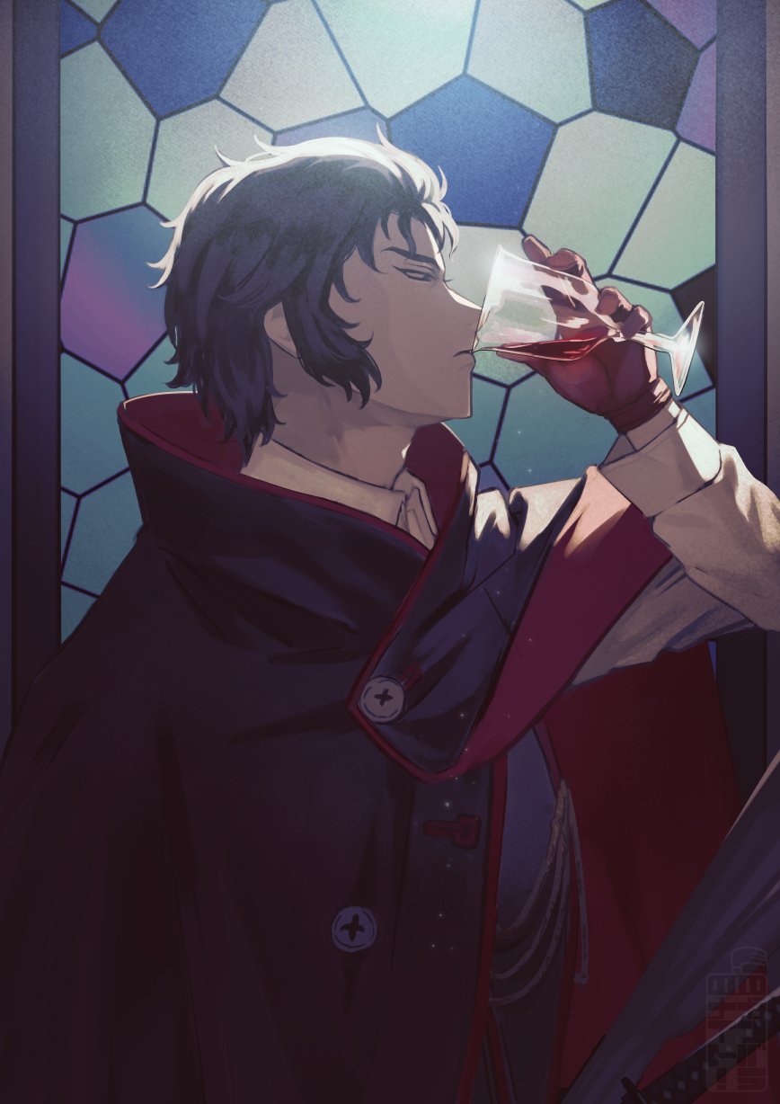 1boy aiguillette alcohol black_cloak black_eyes black_hair black_vest buttons cloak collared_shirt cup drinking drinking_glass fate/grand_order fate_(series) from_side gloves hair_slicked_back hand_up highres hijikata_toshizou_(fate) hilt holding holding_cup katana light_particles long_sleeves looking_at_object male_focus profile red_gloves shirt short_hair solo stained_glass sword teria_(teriarian) upper_body vest weapon white_shirt wine wine_glass