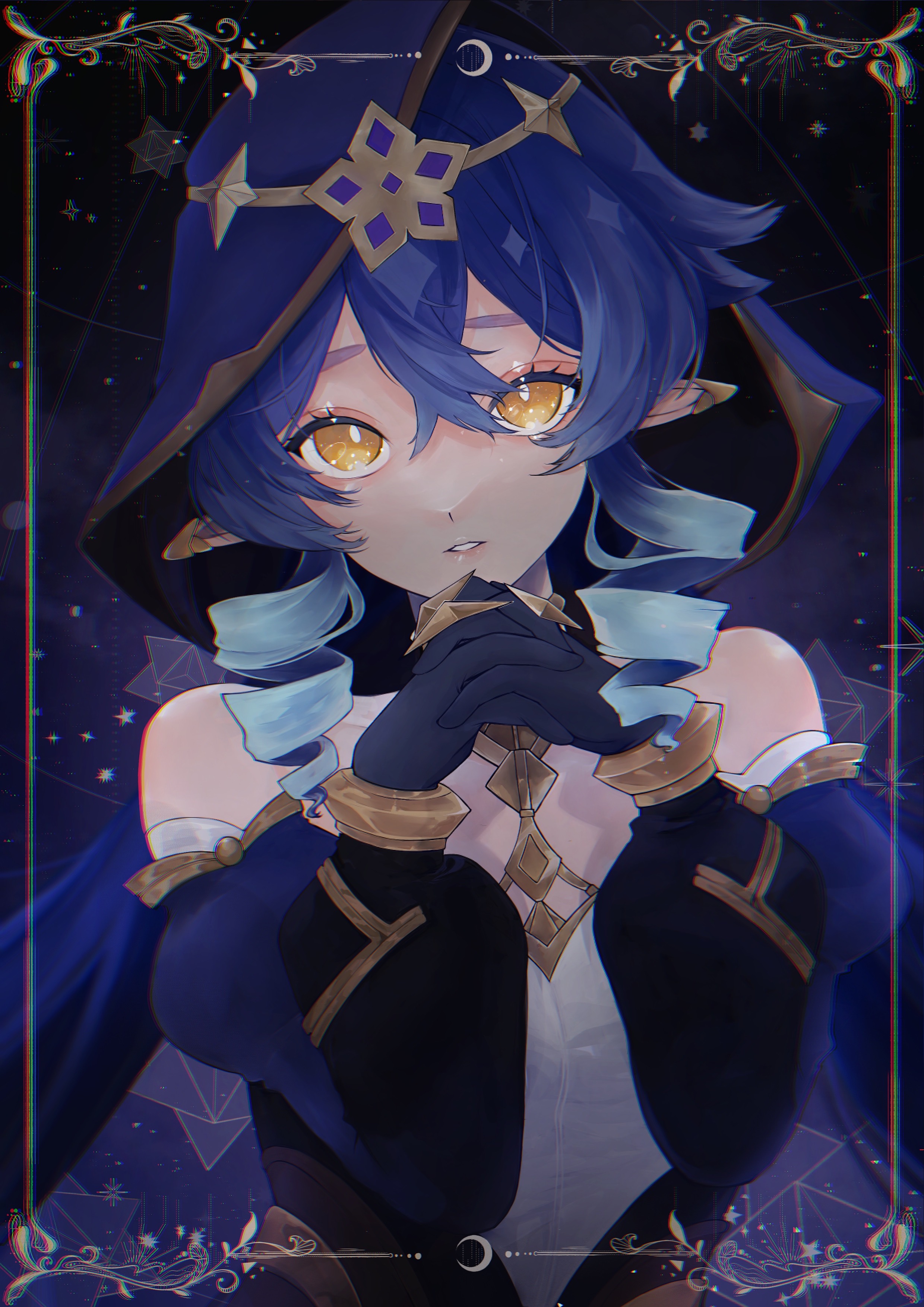 1girl absurdres arano_(waikuni11) bare_shoulders black_gloves blue_hair blue_hood blue_sleeves bright_pupils chromatic_aberration claw_ring colored_tips detached_sleeves drill_hair drill_sidelocks genshin_impact gloves gold_choker gold_trim hair_between_eyes highres hood hood_up jewelry layla_(genshin_impact) lips long_sleeves multicolored_hair neck_ring night own_hands_clasped own_hands_together parted_lips pointy_ears puffy_long_sleeves puffy_sleeves sidelocks sky solo star_(sky) starry_sky upper_body white_pupils yellow_eyes