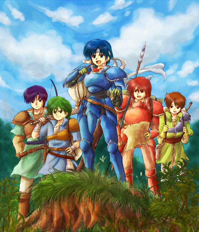 5boys :d alm_(fire_emblem) armor blue_armor blue_eyes blue_hair brown_hair fire_emblem fire_emblem_gaiden gray_(fire_emblem) green_hair holding holding_map holding_sword holding_weapon kliff_(fire_emblem) lukas_(fire_emblem) map multiple_boys nintendo open_mouth outdoors purple_hair red-50869 red_armor red_hair smile standing sword tobin_(fire_emblem) weapon