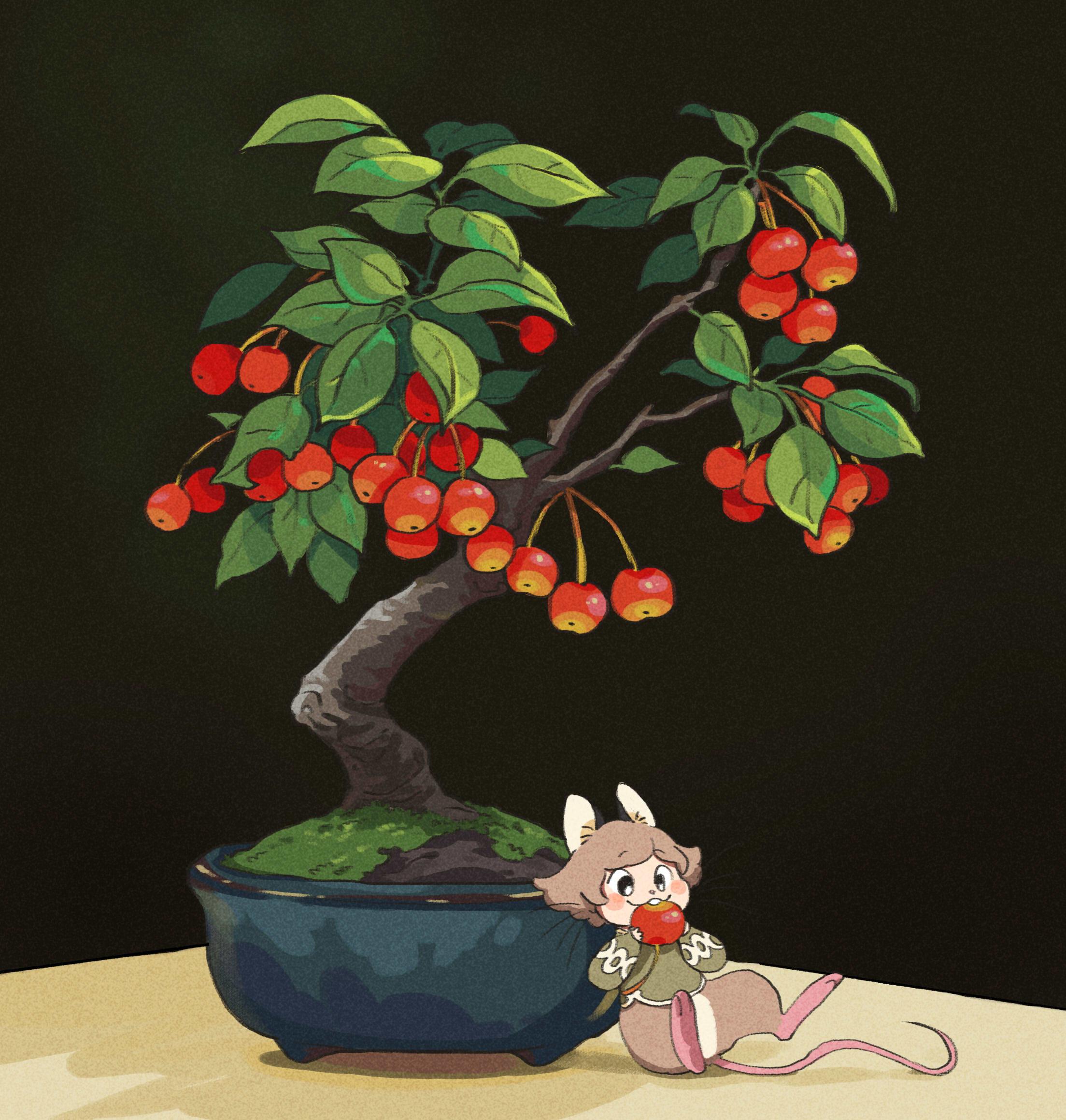 1other :3 animal_ears black_background black_eyes bonsai brown_fur brown_hair buck_teeth cherry cherry_tree fang flower_pot food food_in_mouth fruit furry green_shirt hands_up highres holding holding_food hua_hua_de_meme lying moss mouse_(animal) mouse_ears mouse_tail on_back original shirt tail teeth