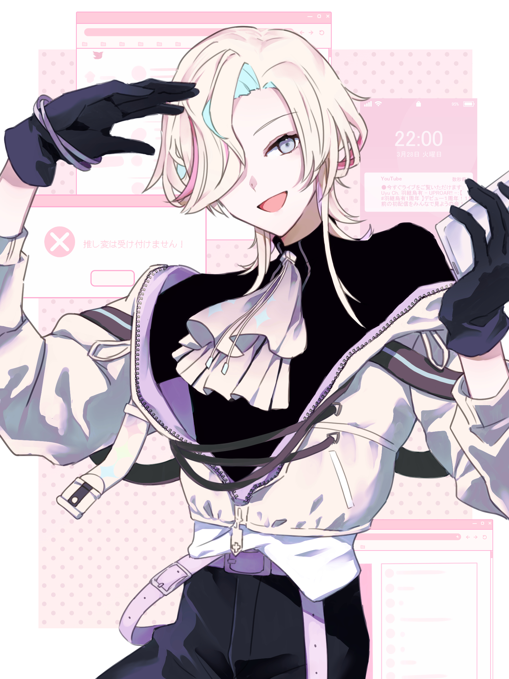 0_sakana_san 1boy :d aqua_hair ascot belt belt_buckle black_gloves black_pants black_shirt blonde_hair border bracelet buckle cellphone cellphone_photo colored_inner_hair cowboy_shot cropped_jacket error_message gloves grey_eyes hair_over_one_eye hand_up high-waist_pants highres holding holding_phone holostars jacket jewelry looking_at_viewer male_focus medium_hair multicolored_hair open_mouth outside_border pants phone pink_ascot pink_background pink_hair polka_dot polka_dot_background purple_belt purple_hair shirt smartphone smile solo streaked_hair turtleneck two-tone_shirt utsugi_uyu virtual_youtuber white_border white_jacket white_shirt