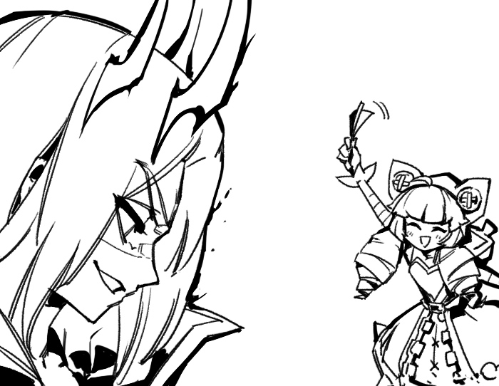 1boy 1girl animal_ears arm_up crown dress drill_hair facing_another fake_animal_ears greyscale grin gwen_(league_of_legends) holding league_of_legends long_hair long_sleeves monochrome phantom_cross profile smile soul_fighter_gwen soul_fighter_viego teeth twin_drills twintails viego_(league_of_legends)