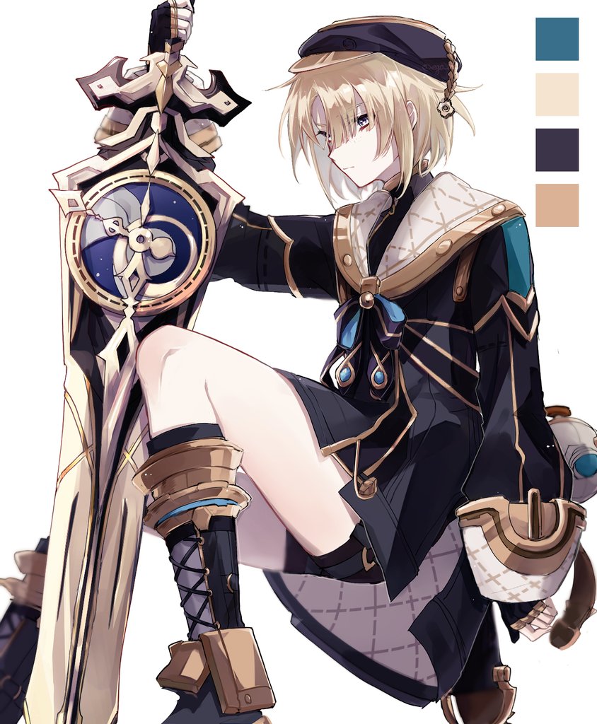 1boy beret black_boots black_hat black_jacket black_shorts blonde_hair blue_eyes blue_shirt boots color_guide ego_(ego_inp) fingerless_gloves freckles freminet_(genshin_impact) full_body genshin_impact gloves hat holding holding_weapon jacket long_sleeves male_focus shirt shorts solo the_bell_(genshin_impact) weapon white_background