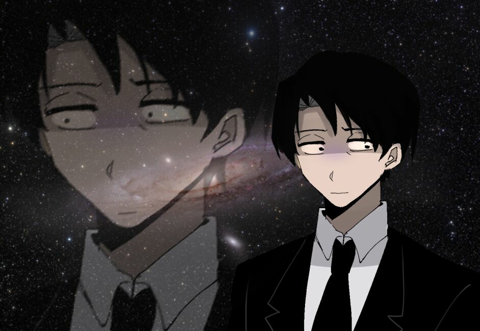 1boy black_jacket black_necktie closed_mouth collared_shirt confused hillsbeichen jacket library_of_ruina looking_to_the_side male_focus meme multiple_views necktie project_moon roland_(project_moon) shaded_face shirt space space_cat_(meme) white_shirt wing_collar
