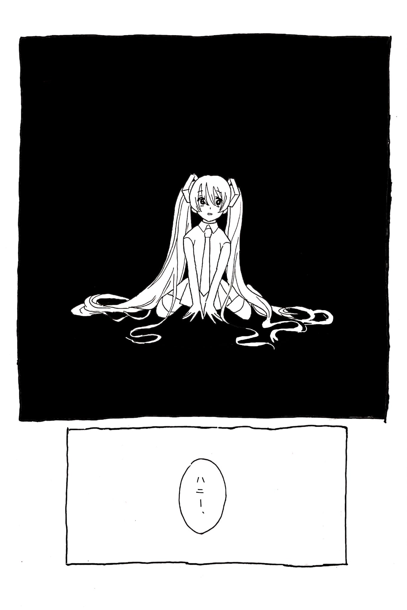 1girl arm_support blank_stare bright_pupils collared_shirt comic commentary_request dark_background greyscale hair_ornament hair_spread_out hatsune_miku highres legs_apart long_hair looking_at_viewer melon_hamburg_bentou monochrome necktie parted_lips pleated_skirt sanji_no_honey_(vocaloid) shirt sitting skirt sleeveless sleeveless_shirt solo straight-on thighhighs translation_request twintails v_arms very_long_hair vocaloid wariza