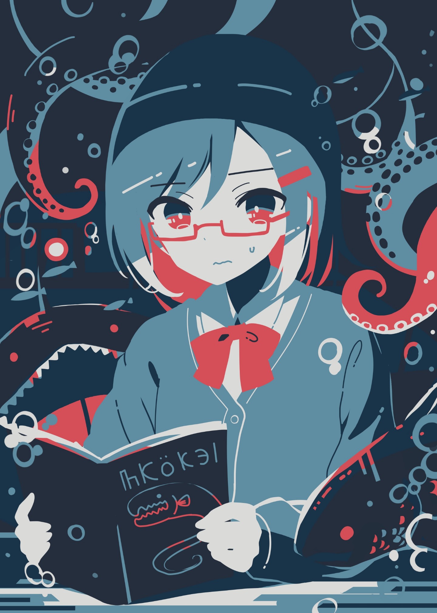 1girl :| blue_background blue_cardigan blue_eyes blue_hair blue_theme book bow bowtie bright_pupils bubble cardigan closed_mouth commentary_request dot_nose fish flat_color furrowed_brow glasses highres holding holding_book limited_palette long_sleeves looking_down mochigome_(ununquadium) multicolored_eyes open_book open_mouth original reading red-framed_eyewear red_bow red_bowtie red_eyes school_uniform semi-rimless_eyewear shark sharp_teeth shirt short_hair solo sweatdrop swept_bangs table teeth tentacles upper_body wavy_mouth white_pupils white_shirt