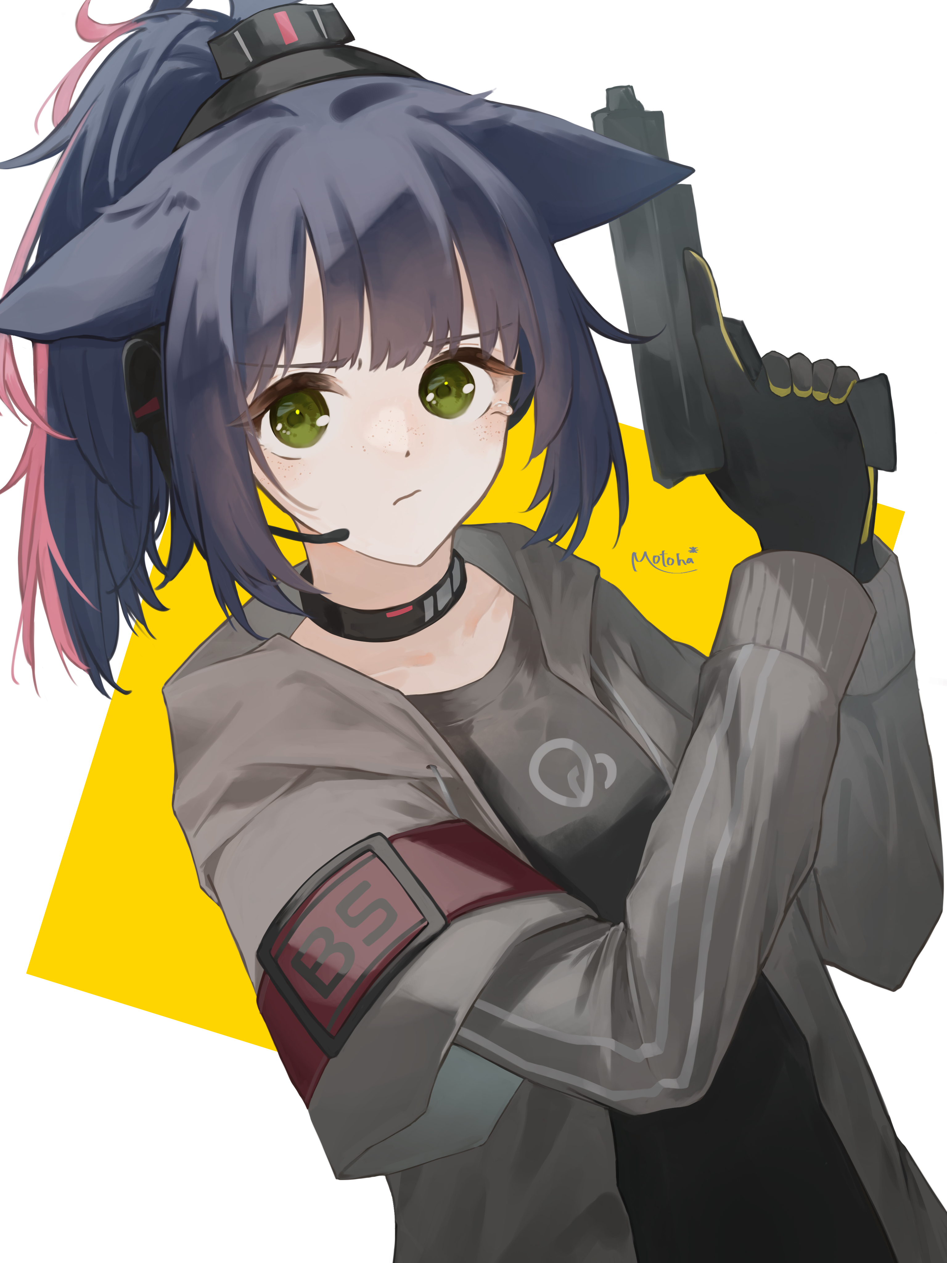 1girl absurdres arknights black_gloves black_hair black_shirt closed_mouth collarbone gloves green_eyes grey_jacket gun hands_up headphones headset highres holding holding_gun holding_weapon jacket jessica_(arknights) layered_sleeves long_sleeves looking_at_viewer motoha multicolored_hair open_clothes open_jacket pink_hair ponytail shirt short_over_long_sleeves short_sleeves sidelocks signature solo two-tone_background two-tone_hair upper_body weapon white_background yellow_background