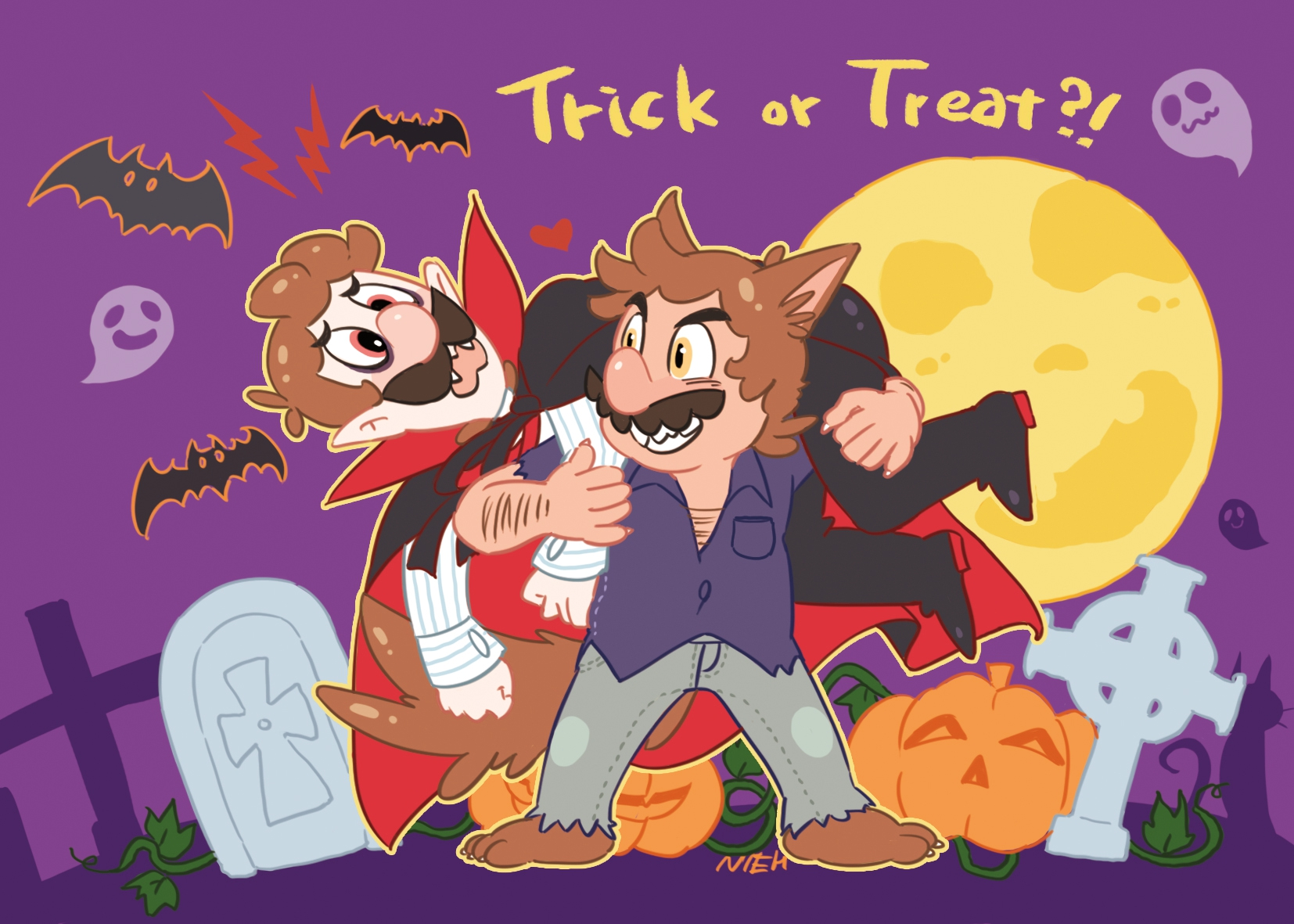 2boys bat_(animal) brothers brown_hair cape carrying chest_hair fireman's_carry full_moon ghost halloween heart highres kemonomimi_mode luigi male_focus mario mario_(series) moon multiple_boys nintendo nowitsevenhotter plant pumpkin purple_background red_eyes siblings tombstone vampire vines werewolf yellow_eyes